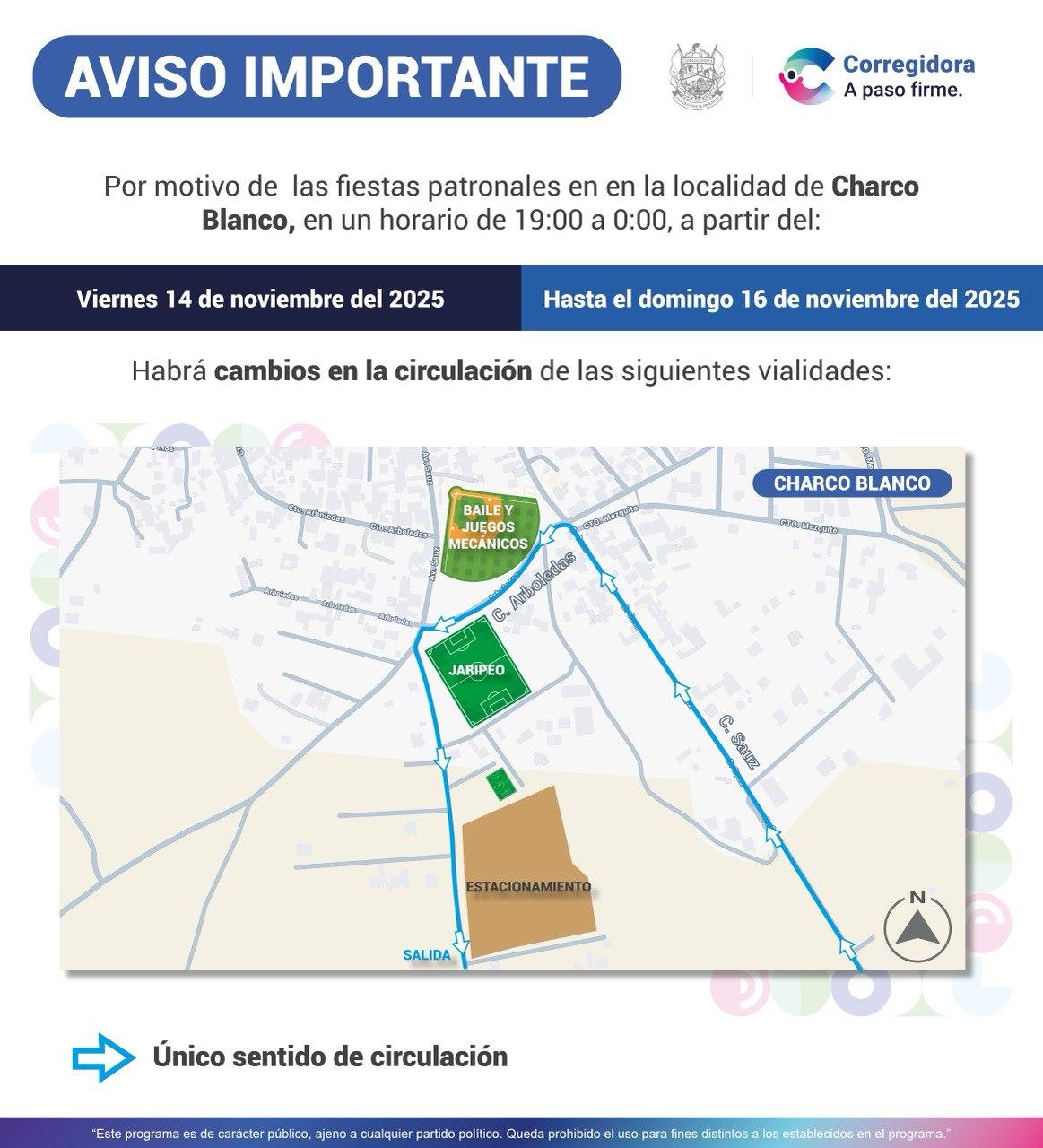 Con motivo de las Fiestas Patronales en la localidad de Charco Blanco, en el municipio de Corregidora, habrán ajustes viales del 14 al 16 de noviembre.