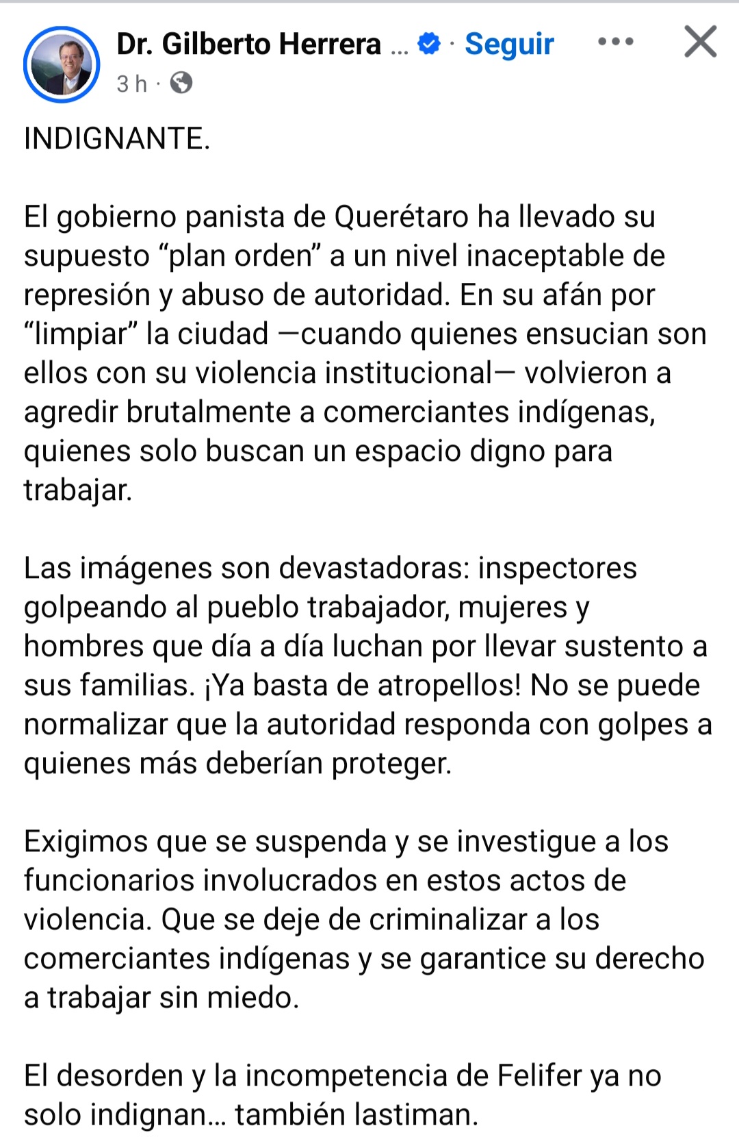"En su afán por 'limpiar' la ciudad -cuando quienes ensucian son ellos con su violencia institucional- volvieron a agredir brutalmente a comerciantes indígenas, quienes solo buscan un espacio digno para trabajar", expuso.