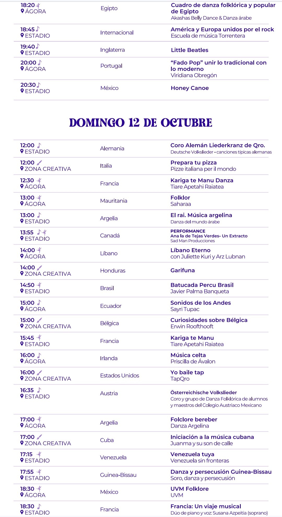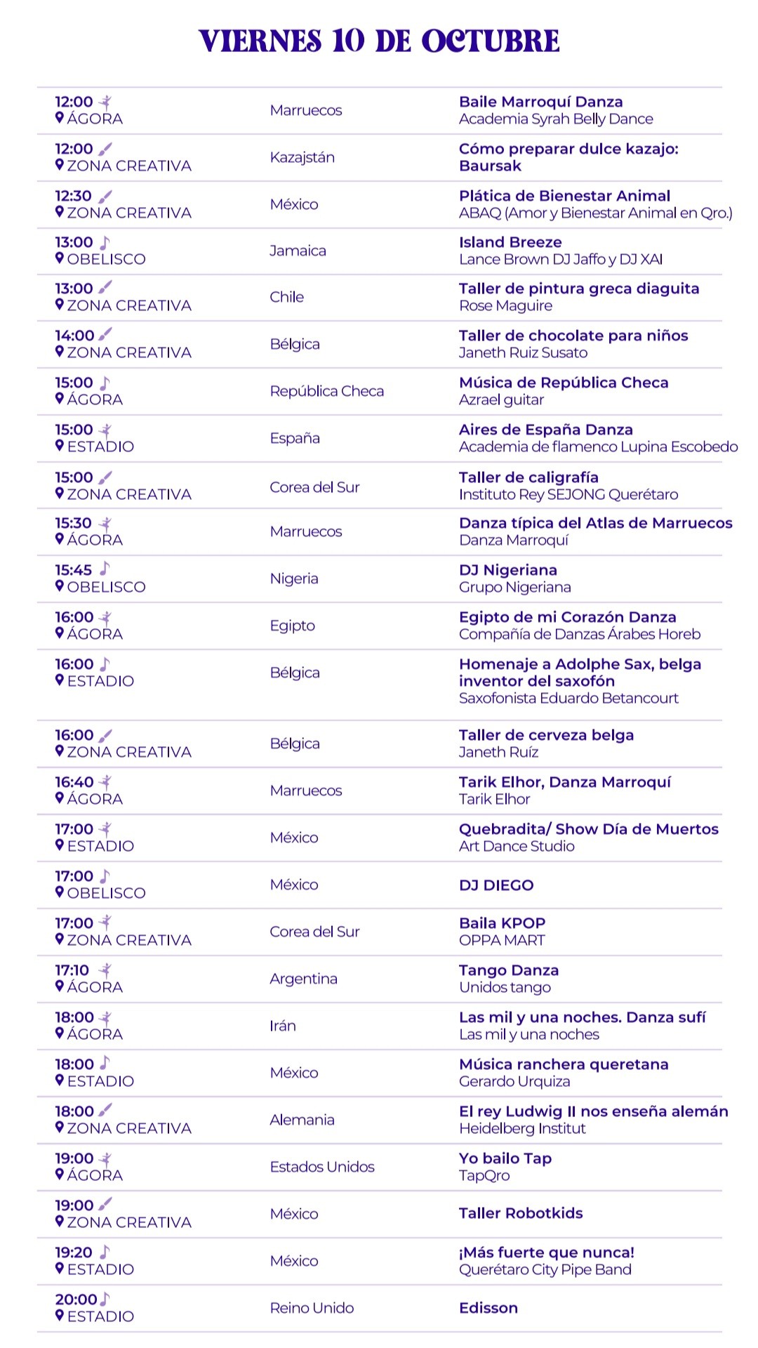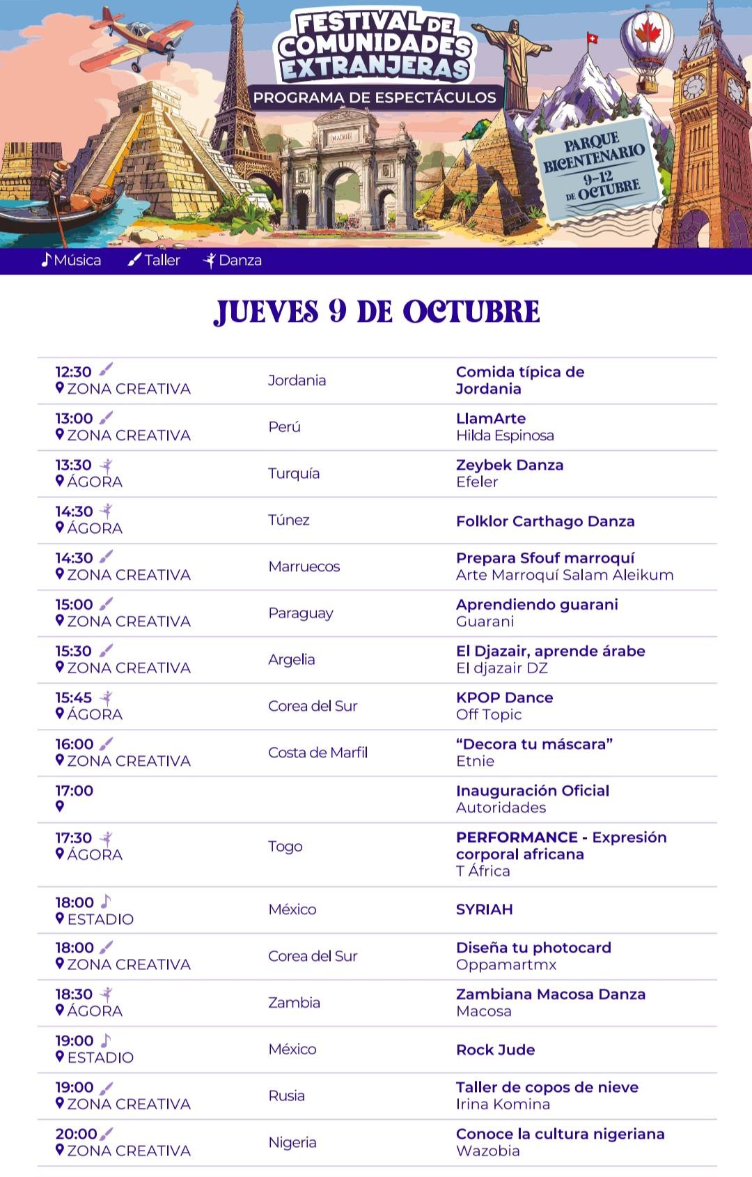 Los visitantes podrán recorrer zonas temáticas de África, América, Asia y Europa, disfrutar de espectáculos de danza y música de más de 60 países, probar gastronomía internacional y descubrir artesanías únicas de cada región. El evento abrirá sus puertas de 10:00 a 22:00 horas, con accesibilidad total para personas con movilidad reducida y carriolas.