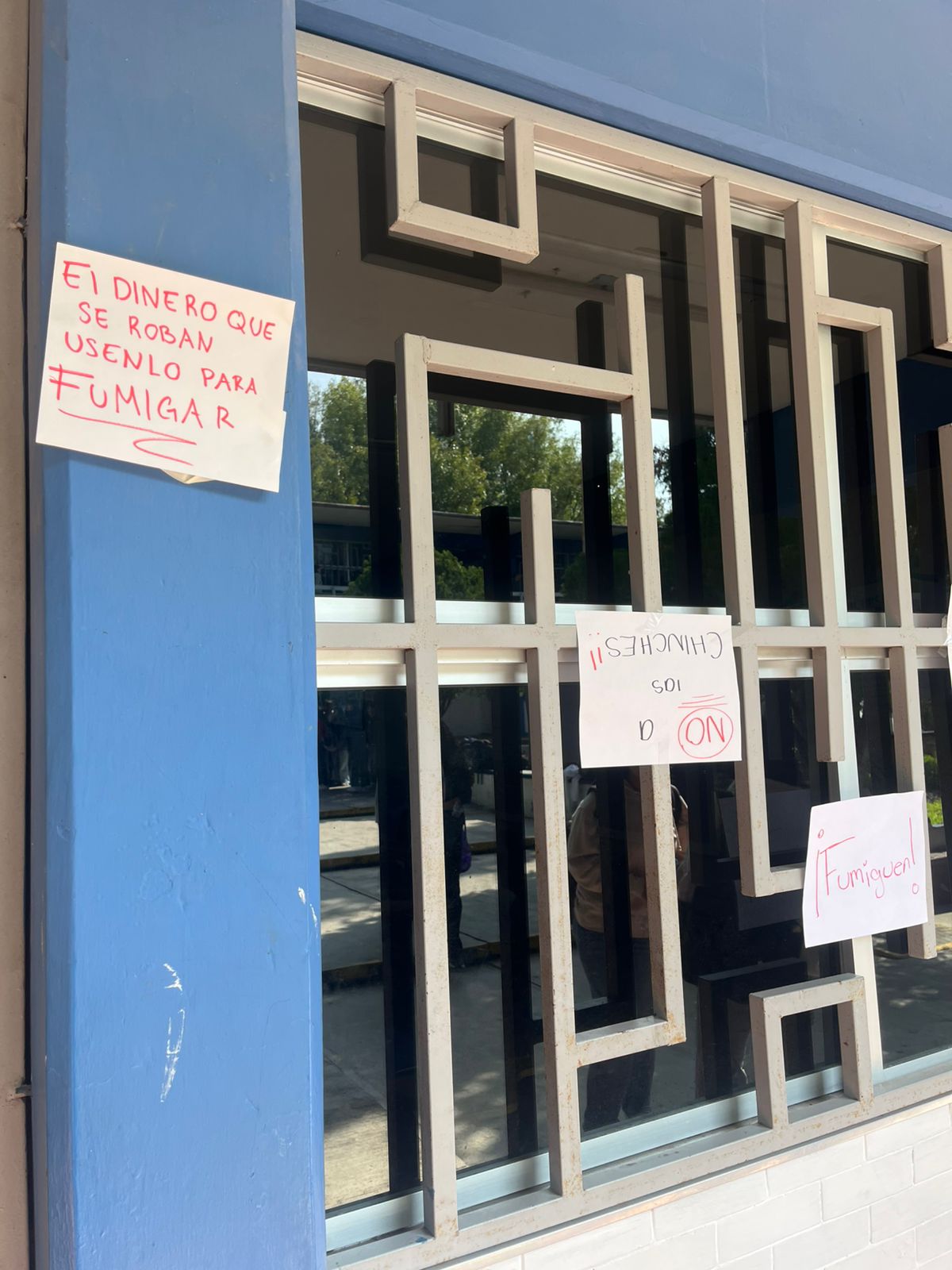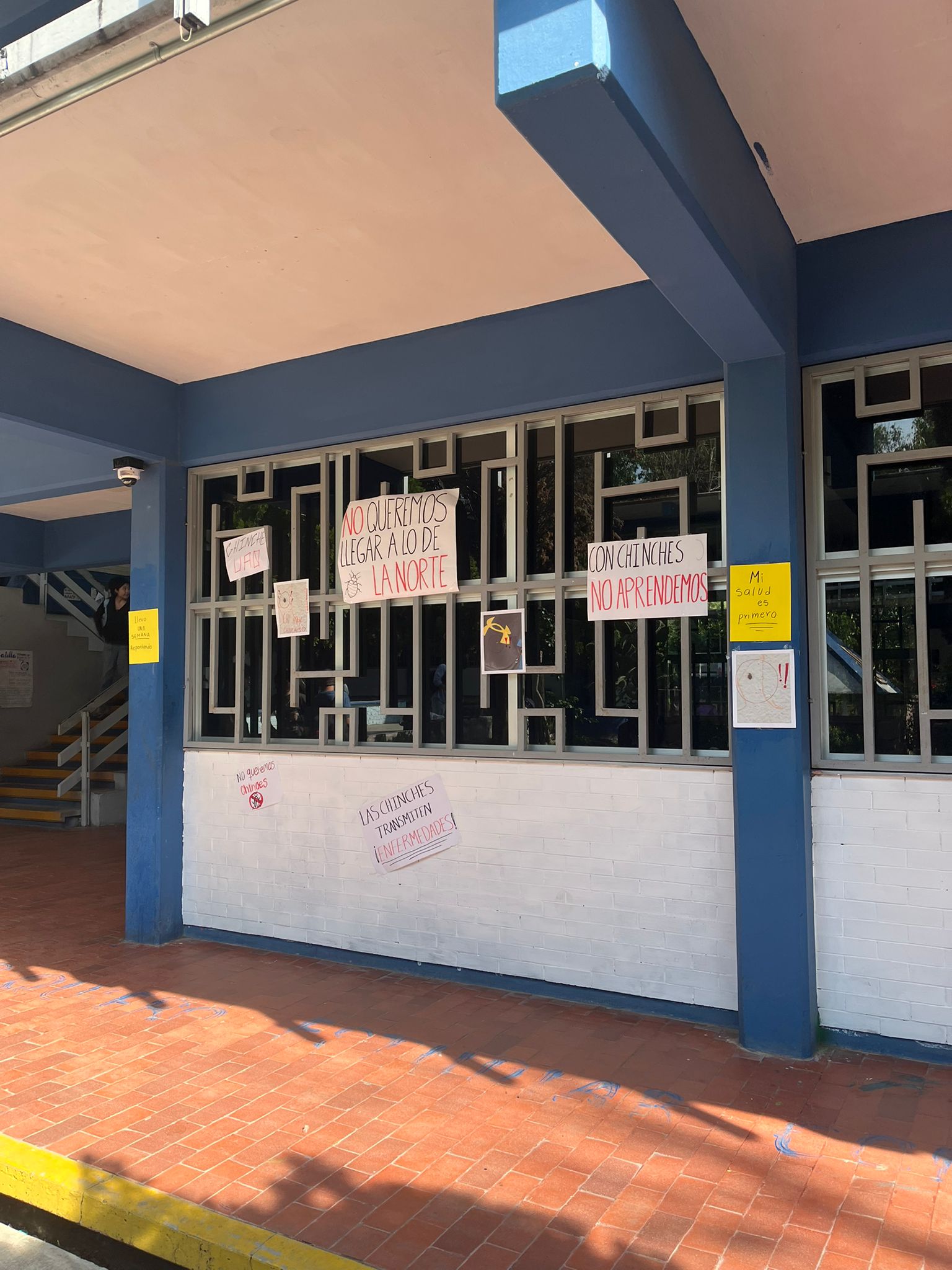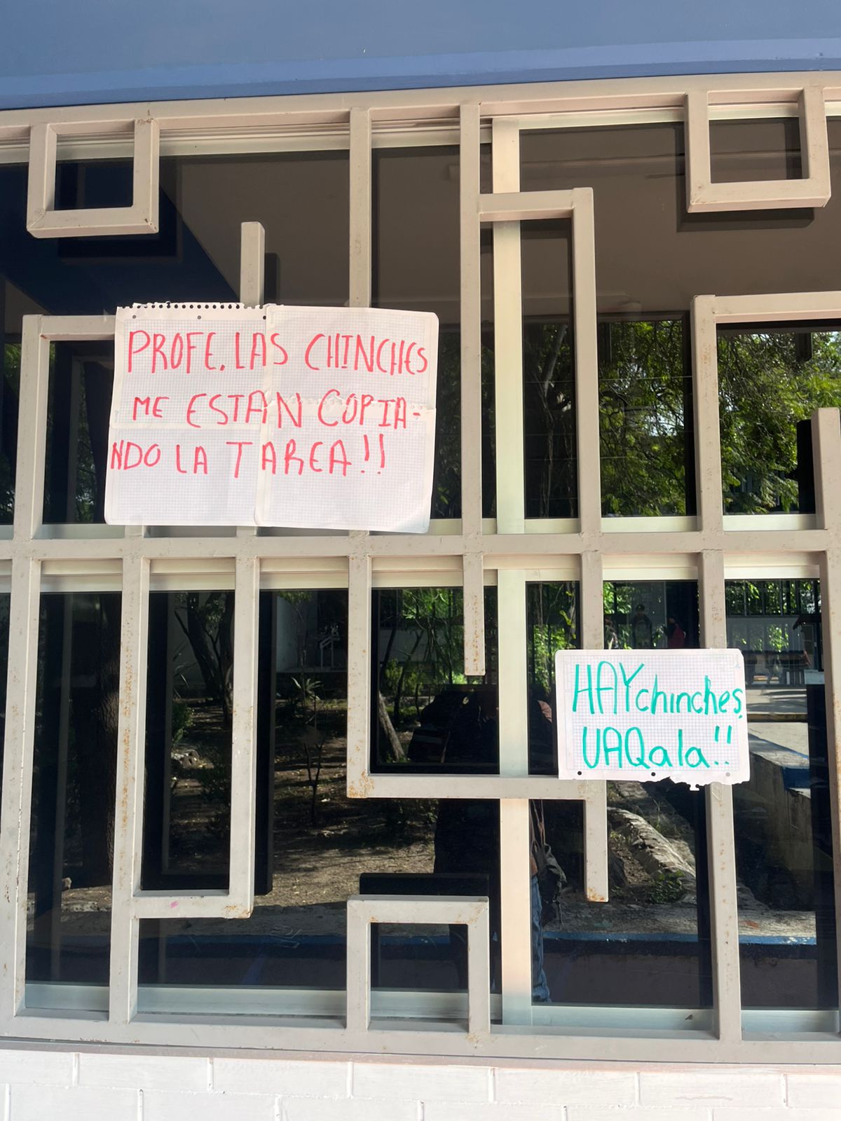 Previo a la evacuación, se colocaron cartulinas en las ventanas de las aulas con mensajes como "con chinches no aprendemos" y "las chinches transmiten enfermedades".