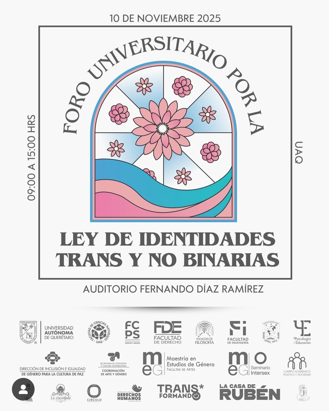 Colectivos en Querétaro y la Universidad Autónoma de Querétaro (UAQ) realizarán el Foro Universitario por la Ley de Identidades Trans y No Binarias el próximo 10 de noviembre.