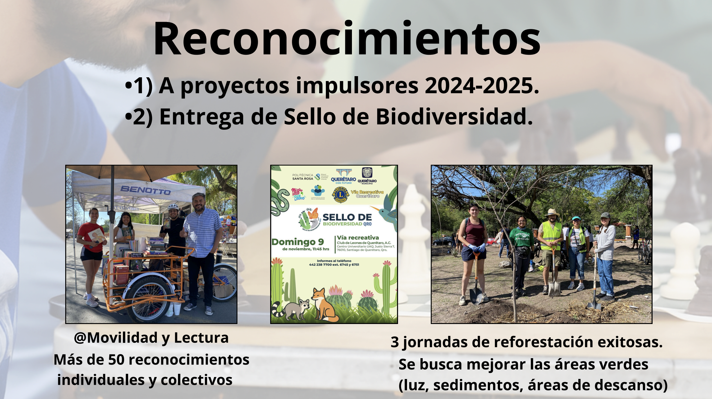 Asimismo, se realizarán dos ceremonias de entrega de reconocimientos: la primera, dirigida a los proyectos impulsores de la Vía Recreativa durante el periodo 2024?2025; y la segunda, por la entrega del Sello de Biodiversidad, otorgado por la Secretaría de Medio Ambiente y la Universidad Politécnica de Santa Rosa, en reconocimiento a las labores de reforestación dentro del circuito.