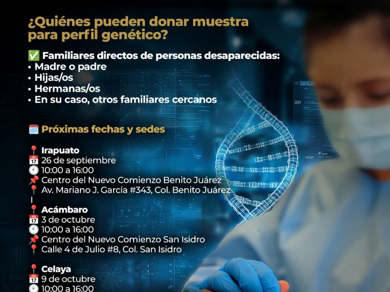 Recientemente la Fiscalía General del Estado de Guanajuato (FGE), activó una jornada de toma de muestras masivas de obtención de perfil génico, de familiares con personas desaparecidas, con la intención de actualizar la información y agilizar los procesos de identificación para no esperar semanas o meses.