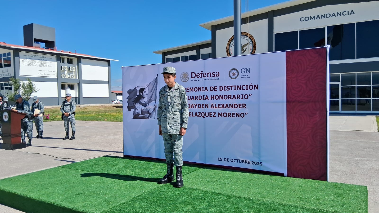 Jayden Alexander Velázquez Moreno se convirtió en el primer Guardia Honorario del 36 batallón de Guardia Nacional de La Manga, en Salamanca; con orgullo portó su uniforme que simboliza todos los valores de las Fuerzas Armadas de México y que fue entregado como muestra a su valentía y deseo de pertenecer y servir a su país a través de esta institución.