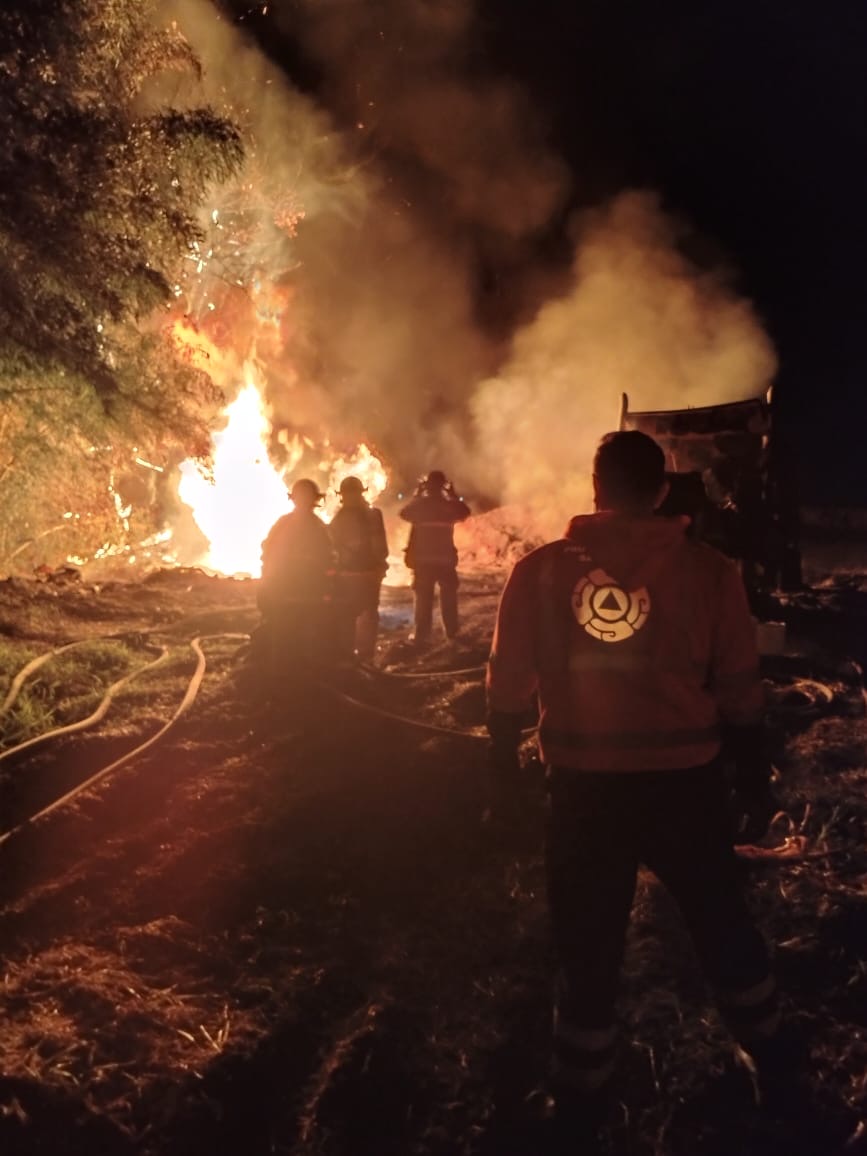 Al arribar al sitio, los cuerpos de emergencia localizaron un camión tipo volteo completamente calcinado, así como contenedores con capacidad de 10 mil litros, de los cuales tres quedaron calcinados y tres más estaban vacíos. Según el reporte preliminar, no se detectó presencia de hidrocarburo en el área.