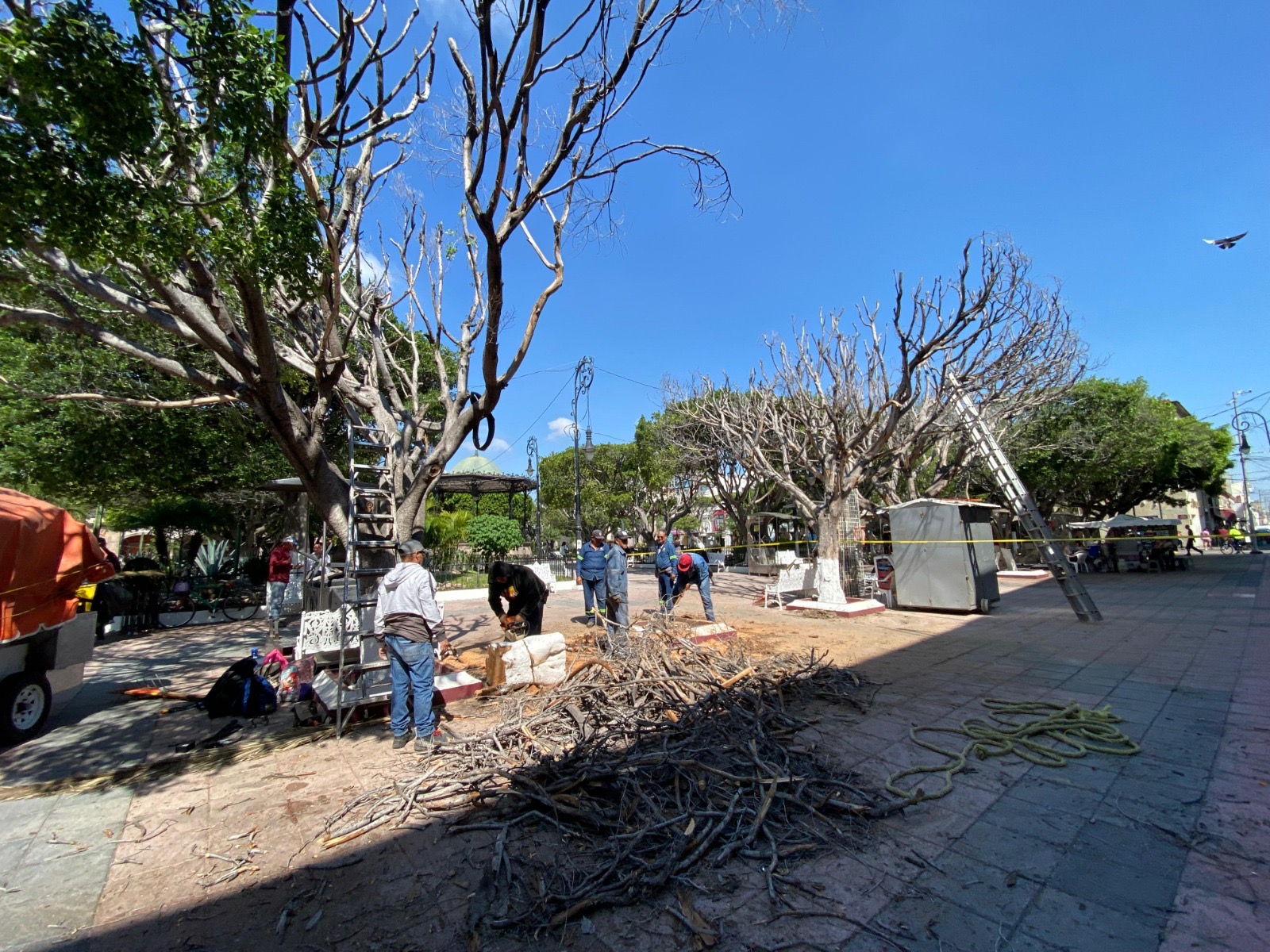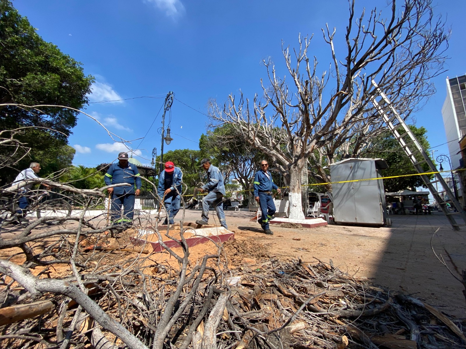 La mañana de este lunes en el Jardín Constitución, inició el retiro de los árboles ficus secos, los cuales serán reemplazados por árboles de la misma especie.