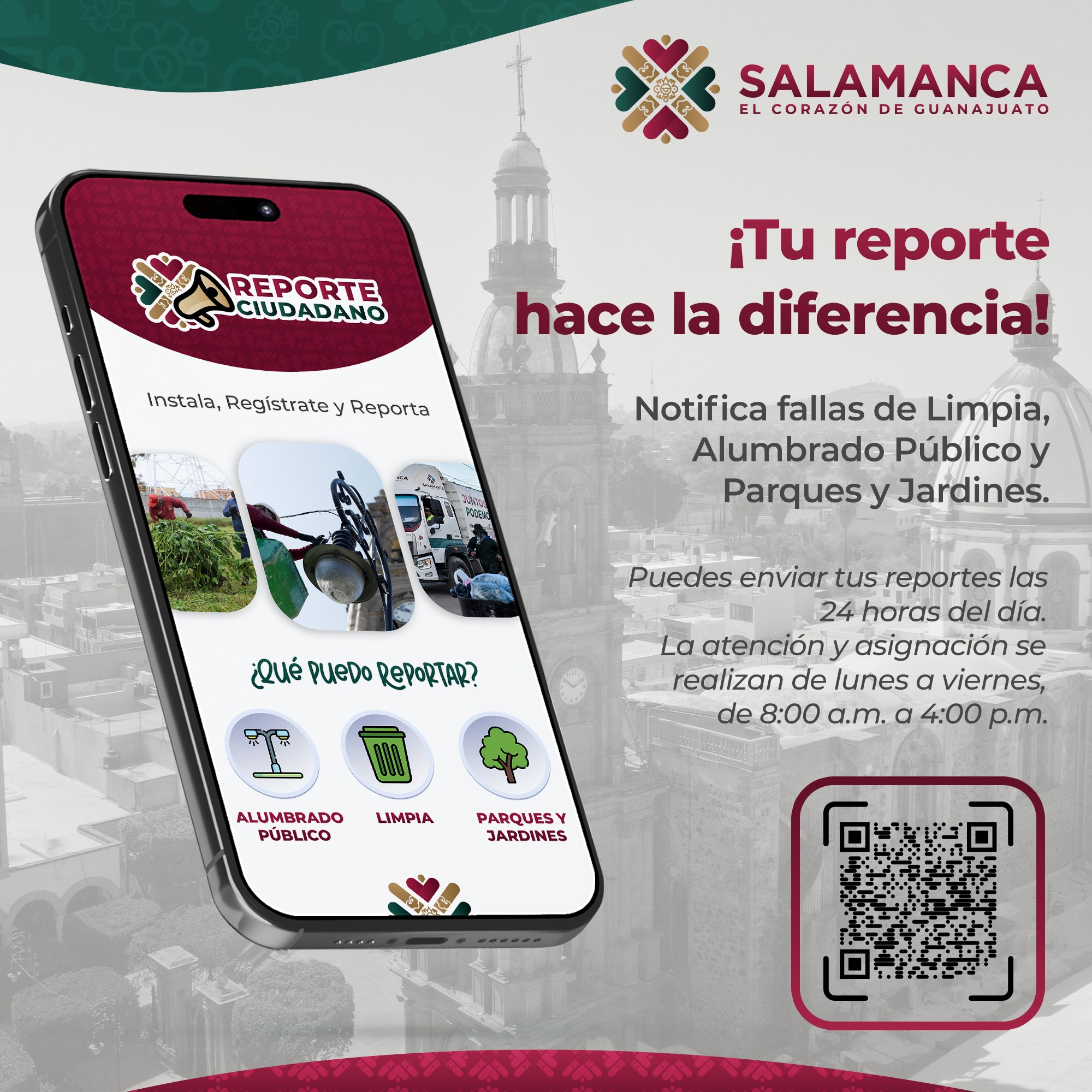 El Gobierno Municipal, puso en marcha la aplicación ? web, para la generación de reportes de servicios públicos, fallas en alumbrado, limpia, parques y jardines, la aplicación puede encontrarse a través de la pagina ciudadano.salamanca. gob.mx lista para descargarse en el móvil.