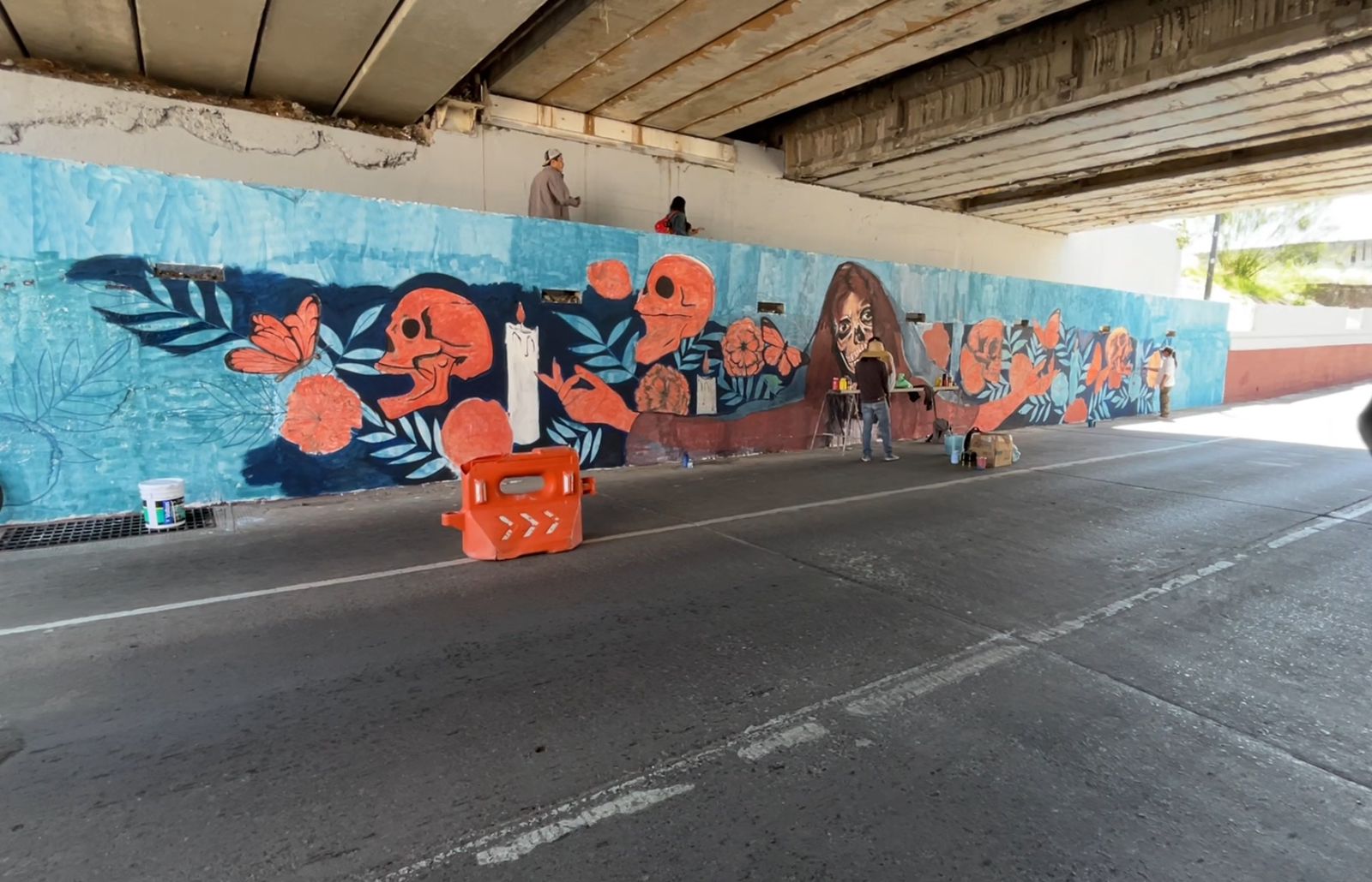 Desde hace dos semanas, en el desnivel de la calle Zaragoza se pinta un mural que rinde homenaje precisamente a esta tradición. La obra tiene como propósito invitar a la reflexión sobre la importancia de nuestras costumbres y recordar que la muerte no debe verse como algo negativo, sino como una parte natural del ciclo de la vida.