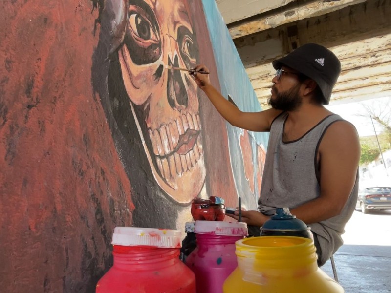 Salmantinos realizan mural en desnivel de Zaragoza por el día de muertos