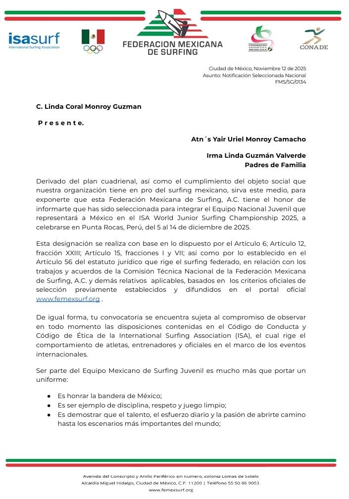 Pues no es para menos, reciente mente se ha dado a conocer que esta joven será la encargada de poner en alto el nombre de México en el Campeonato Mundial Junior de Surf 2025 sub -16 Tabla Corta, organizado por la Asociación Internacional De Surf (ISA) en Punta Roca Perú del 5 al 14 de diciembre del año en curso.