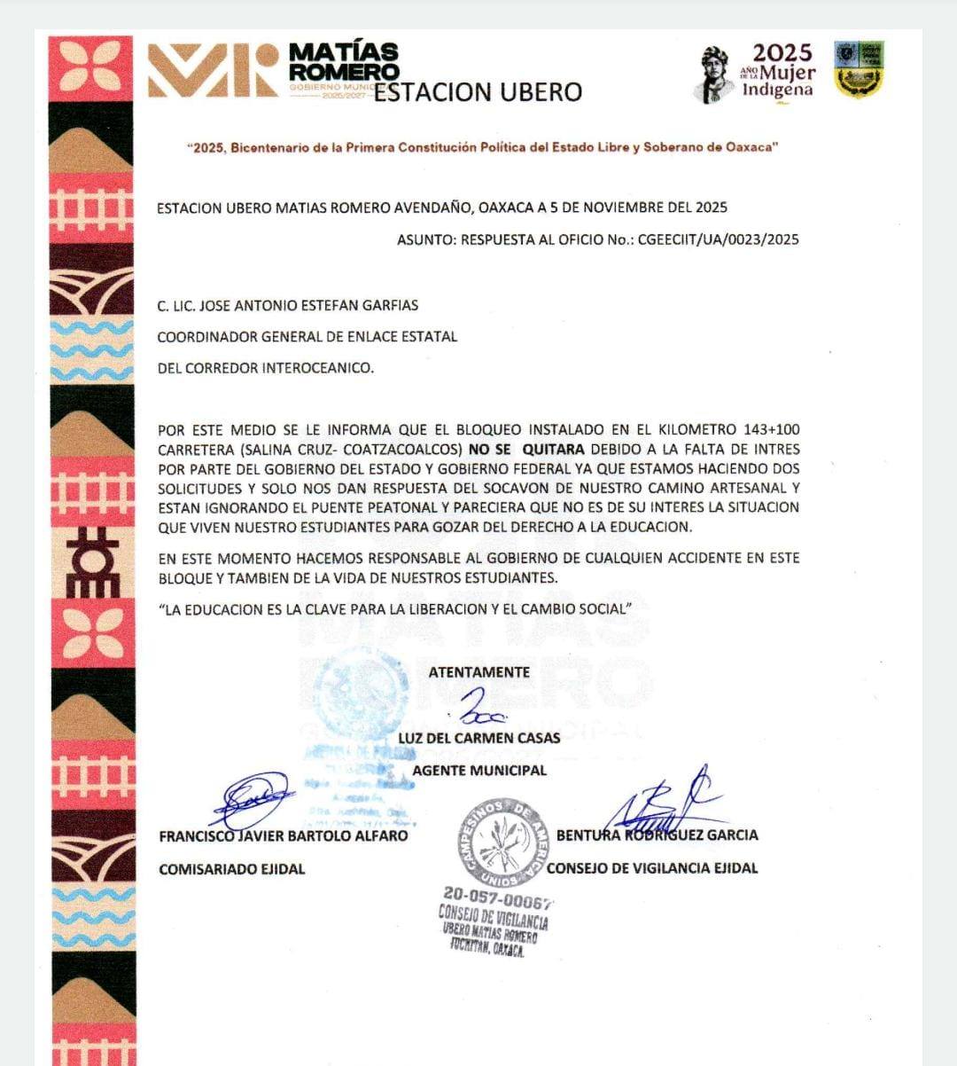 Fue la mañana del miércoles, que un grupo de habitantes de la zona oriente del Istmo de Tehuantepec, instalaron un bloqueo carretero sobre la carretera Transístmica, en el km 143+100 a la altura de nuevo Ubero, para exigir el arreglo de su camino artesanal el cual ya en un buen tramo se deslavo en ambos lados, piden también la construcción de un puente peatonal para que sus hijos puedan cruzar el río que atraviesa por esa comunidad sin peligros ni riesgos, al igual que la constructora que tiene a cargo la estación del tren repare un socavón que se localiza el una avenida cerca de la estación del tren que está en construcción.
