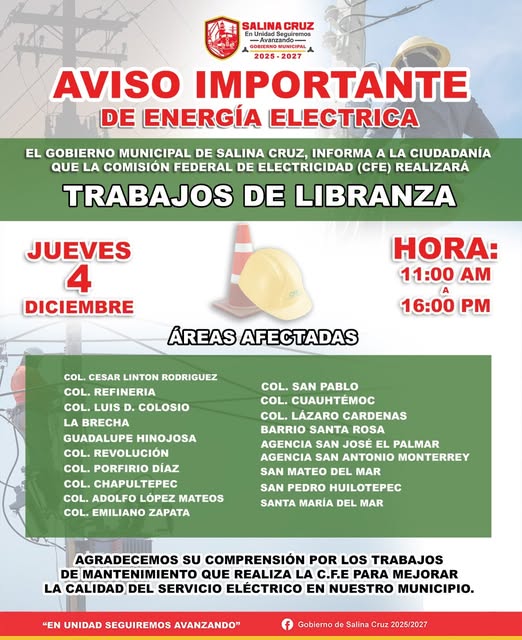 Este miércoles 4 de diciembre, la Comisión Federal de Electricidad (CFE) llevará a cabo trabajos de libranza que requerirán la suspensión temporal del suministro eléctrico en 25 zonas de los municipios de Salina Cruz y Santo Domingo Tehuantepec. Las labores se desarrollarán en un horario de 11:00 de la mañana a 4:00 de la tarde.