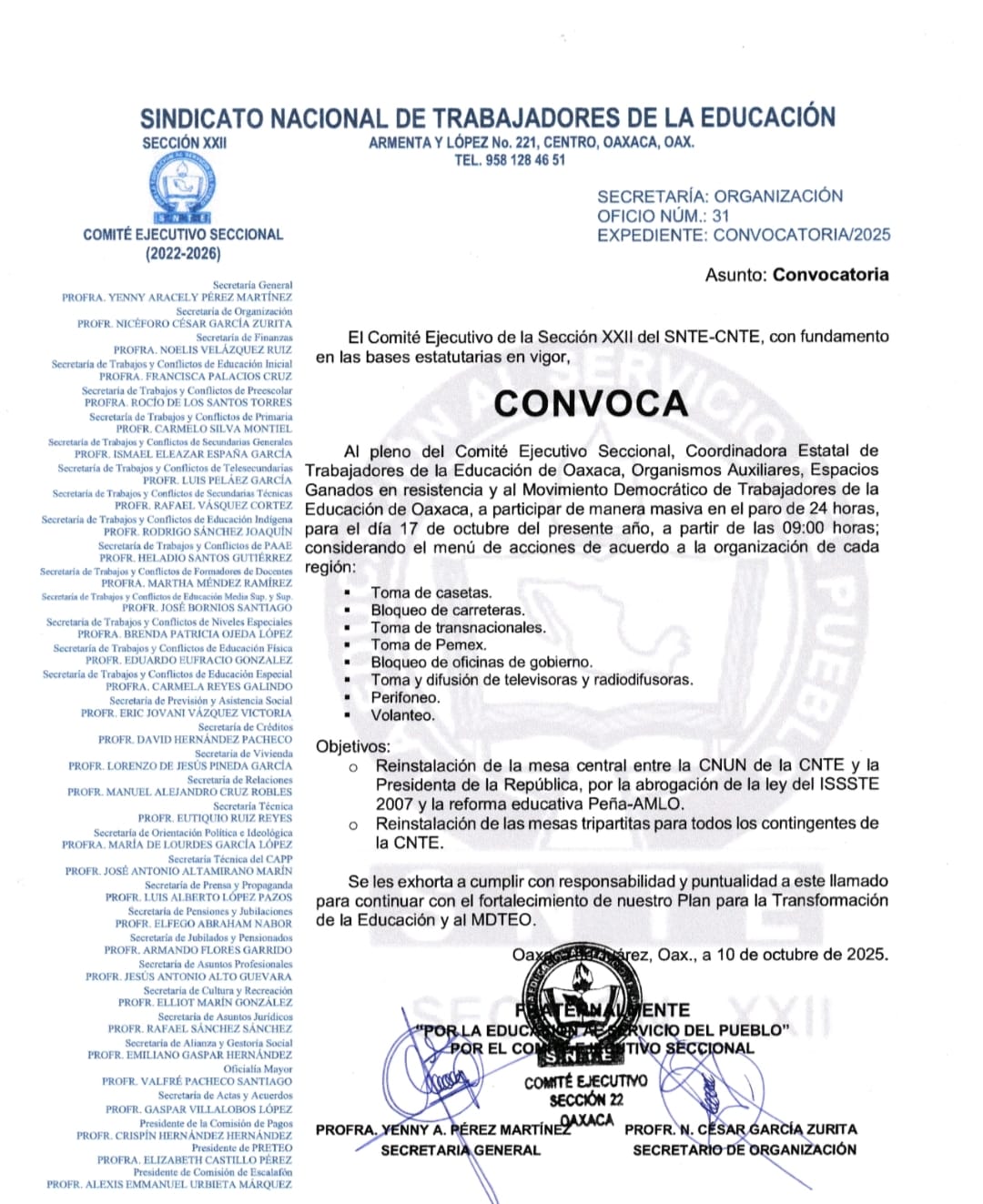 La Secretaría de Trabajos y Conflictos del Nivel de Educación Indígena de la Sección 22 del Sindicato Nacional de Trabajadores de la Educación (SNTE) convocó al magisterio participar en un paro de labores de 48 horas en el nivel de educación indígena y a la marcha estatal, que se realizará el lunes 13 de octubre de 2025 en la capital de Oaxaca.