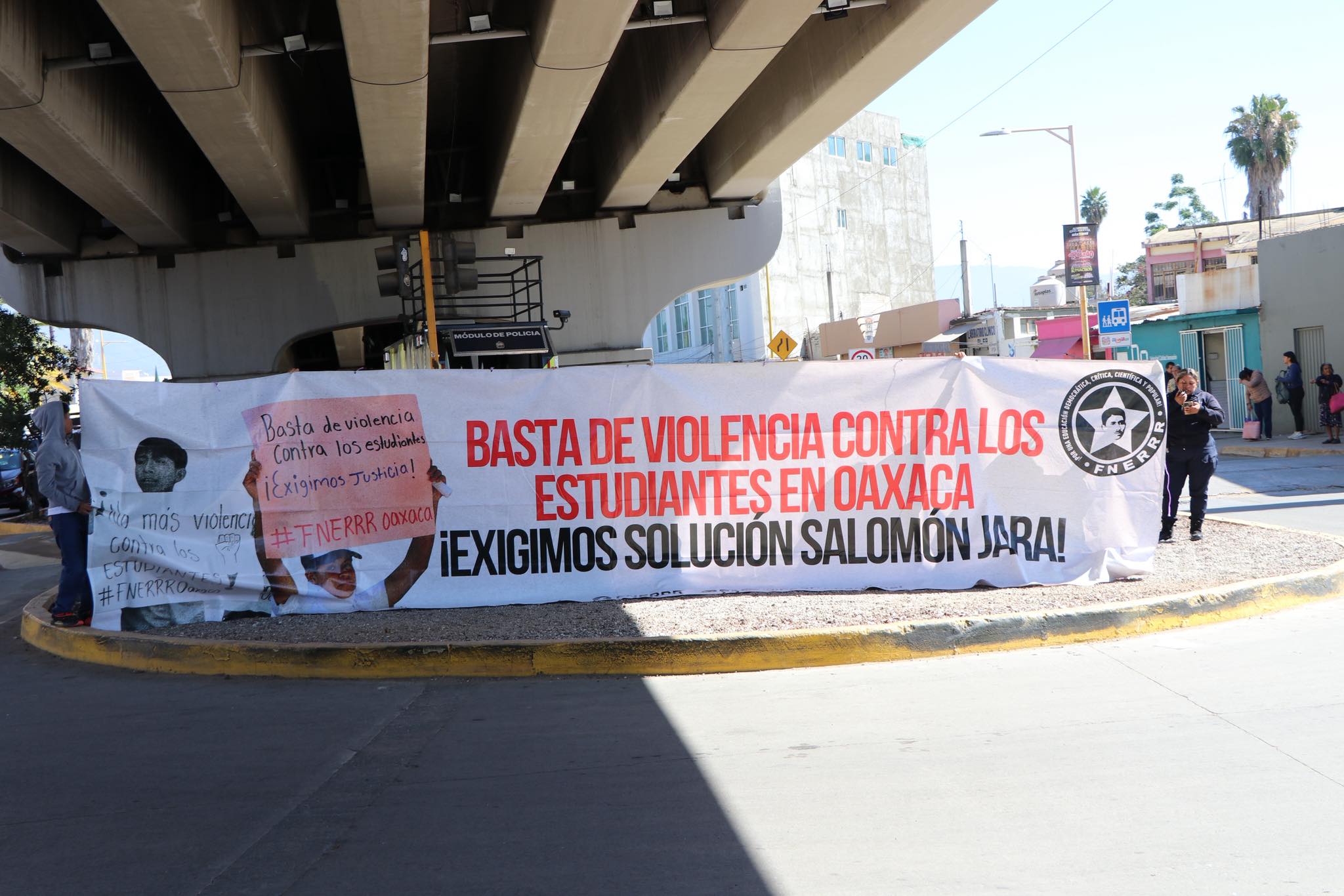 Bajo la consigna, "Basta de violencia contra los estudiantes en Oaxaca, exigimos solución Salomón Jara", los jóvenes pidieron el respaldo de la población en general para defender los albergues estudiantiles.