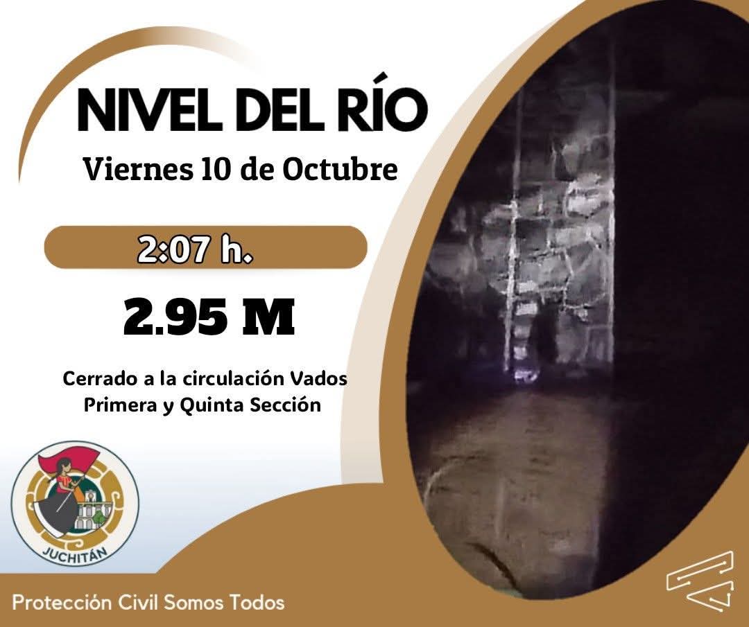 La Coordinación Municipal de Protección Civil de Juchitán de Zaragoza, informó, que el río alcanzó los 3 metros de altura, niveles que permitieron el desbordamiento del mismo, en niveles menores, en algunas zonas bajas del municipio, sin que esto afectara en gran manera a la población.