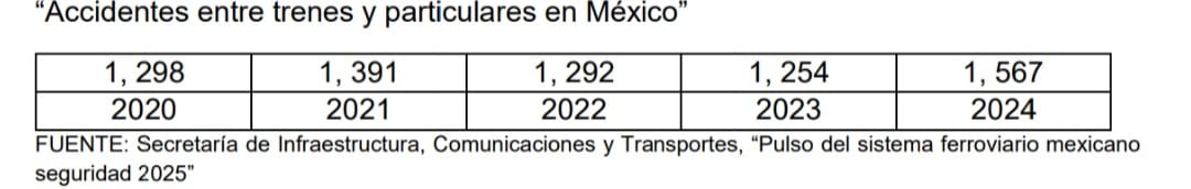 Ahora bien, en los últimos 5 periodos, el año con más accidentes, desde arrollamiento de vehículos, alcances, descarrilamientos, rozamientos, muertes o lesiones en derecho de vía, en el sistema ferroviario mexicano fue 2024 con mil 567 registros.