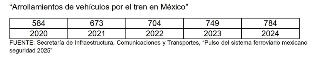 Reportes mensuales de arrollamientos de vehículos en el Sistema Ferroviario Mexicano entre 2020 y 2024, ubico al año pasado como el de mayo incidencia con 784 registros.