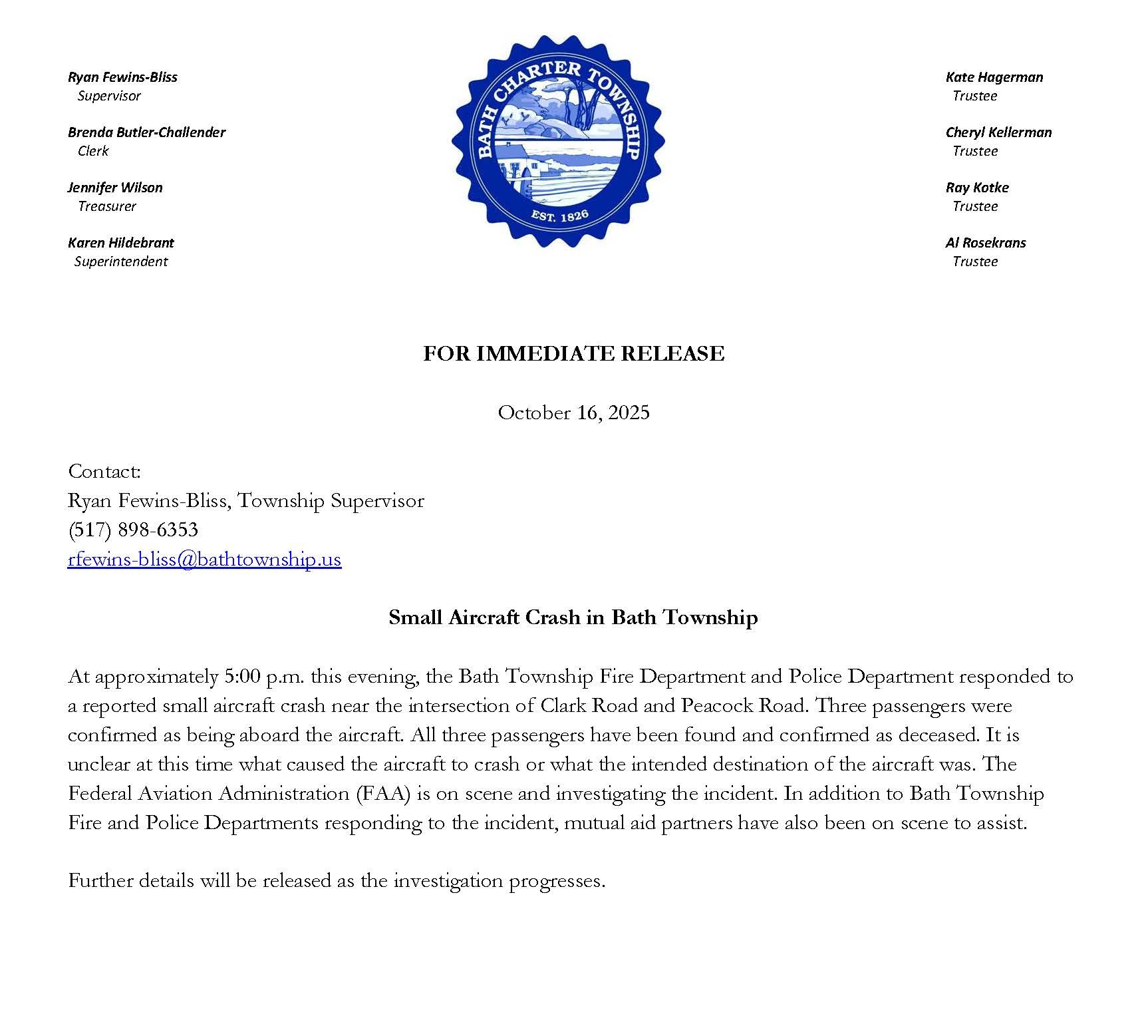 El accidente ocurrió alrededor de las 17:00 horas, cuando los equipos de emergencia fueron alertados sobre la caída de una aeronave en una zona boscosa cercana a Bath. Elementos de la policía y del departamento de bomberos acudieron al lugar para realizar labores de rescate y aseguramiento del área.