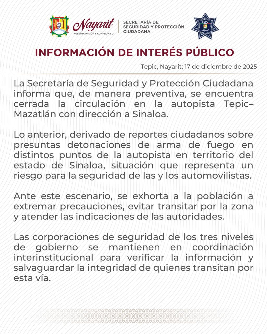 La Secretaría de Seguridad y Protección Ciudadana (SSPC) informó que el cierre se realizó de manera preventiva y aplica en el tramo con dirección a Sinaloa, debido a que la situación representa un riesgo para la seguridad de las y los automovilistas.