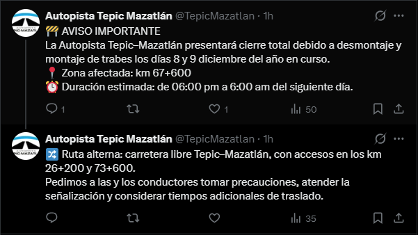 Como alternativa, se podrá utilizar la carretera libre Tepic?Mazatlán, con incorporaciones en los kilómetros 26+200 y 73+600; se recomienda a quienes vayan a circular por la zona considerar tiempos adicionales de traslado, estar atentos a la señalización y mantener una conducción prudente mientras duren las maniobras.