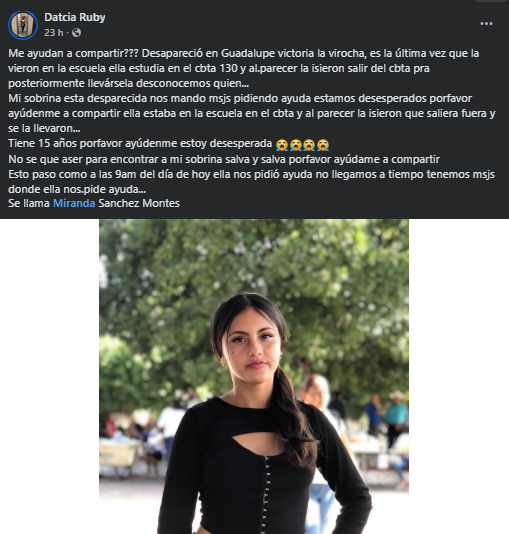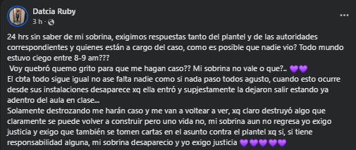 Los familiares afirman que, al parecer, alguien la hizo salir del plantel y posteriormente se la llevaron personas no identificadas. "Mi sobrina está desaparecida; nos mandó mensajes pidiendo ayuda. Estamos desesperados, por favor ayúdennos a compartir. Ella estaba en la escuela y, al parecer, la hicieron salir y se la llevaron", expresaron familiares en publicaciones difundidas en redes sociales; señalan que el último contacto con la menor ocurrió entre las 8:00 y 9:00 de la mañana del jueves.