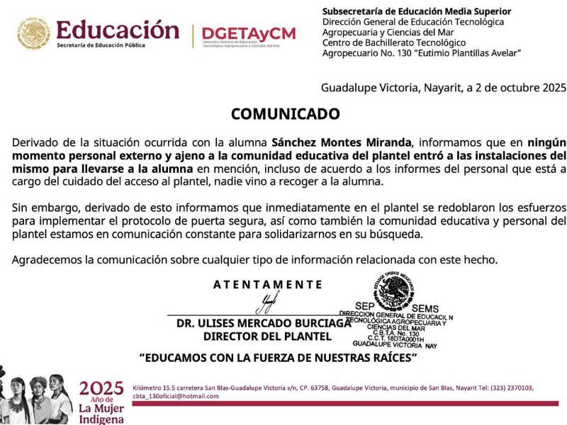 El plantel respondió con un comunicado oficial fechado el 2 de octubre y firmado por el director Ulises Mercado Burciaga, en el que aseguró que "en ningún momento personal externo y ajeno a la comunidad educativa del plantel entró a las instalaciones para llevarse a la alumna" y que, según los reportes del personal de acceso, nadie acudió a recogerla; la escuela afirmó que reforzó el protocolo de puerta segura y mantiene comunicación constante con la comunidad educativa para solidarizarse en la búsqueda.