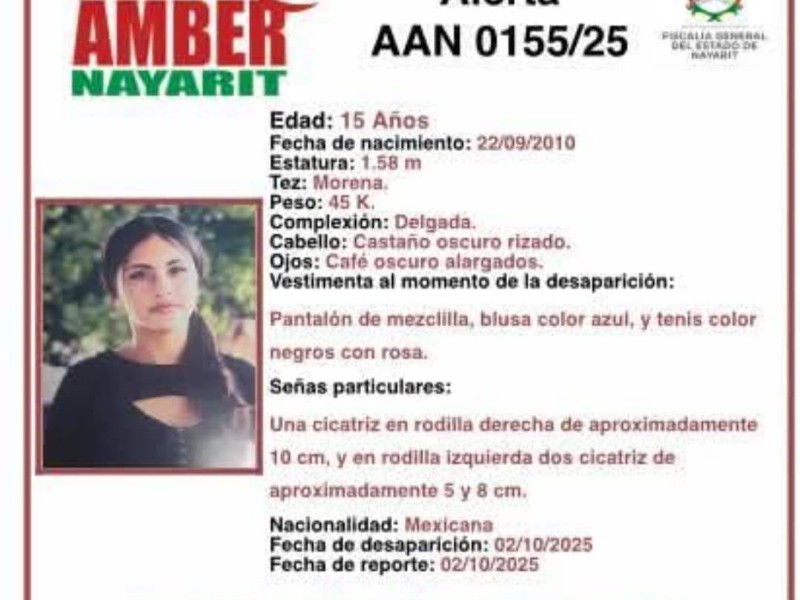 Familiares y autoridades educativas buscan a Miranda Sánchez Montes, de 15 años, vista por última vez la mañana del 2 de octubre de 2025 en Guadalupe Victoria (La Virocha), municipio de San Blas; de acuerdo con la familia, la joven envió mensajes pidiendo ayuda porque se sentía en peligro; cuando sus familiares llegaron al CBTA 130, ya no la encontraron.