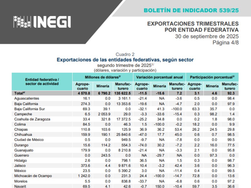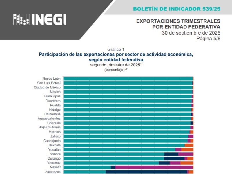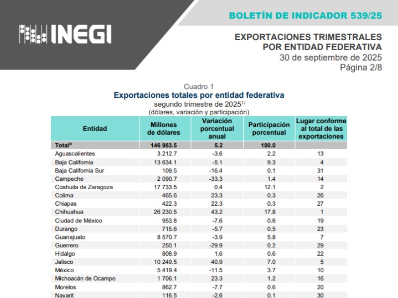 De acuerdo con los datos del INEGI, Nayarit registró 116.5 millones de dólares en exportaciones durante el segundo trimestre de 2025, una baja anual de 2.6% y una participación de 0.1% del total nacional, lo que coloca a la entidad en el puesto 30 de 32; a nivel nacional, las exportaciones estatales sumaron 146,983.5 mdd, con un crecimiento anual de 5.2%
