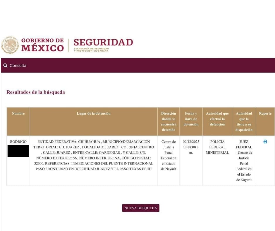 En un primer momento se registró que Rodrigo "N" se encontraba "en traslado" después de su recepción en Ciudad Juárez; posteriormente se confirmó su arribo a Tepic para la celebración de la audiencia inicial, en la que se le harán saber formalmente los delitos que se le imputan y se definirá su situación jurídica.