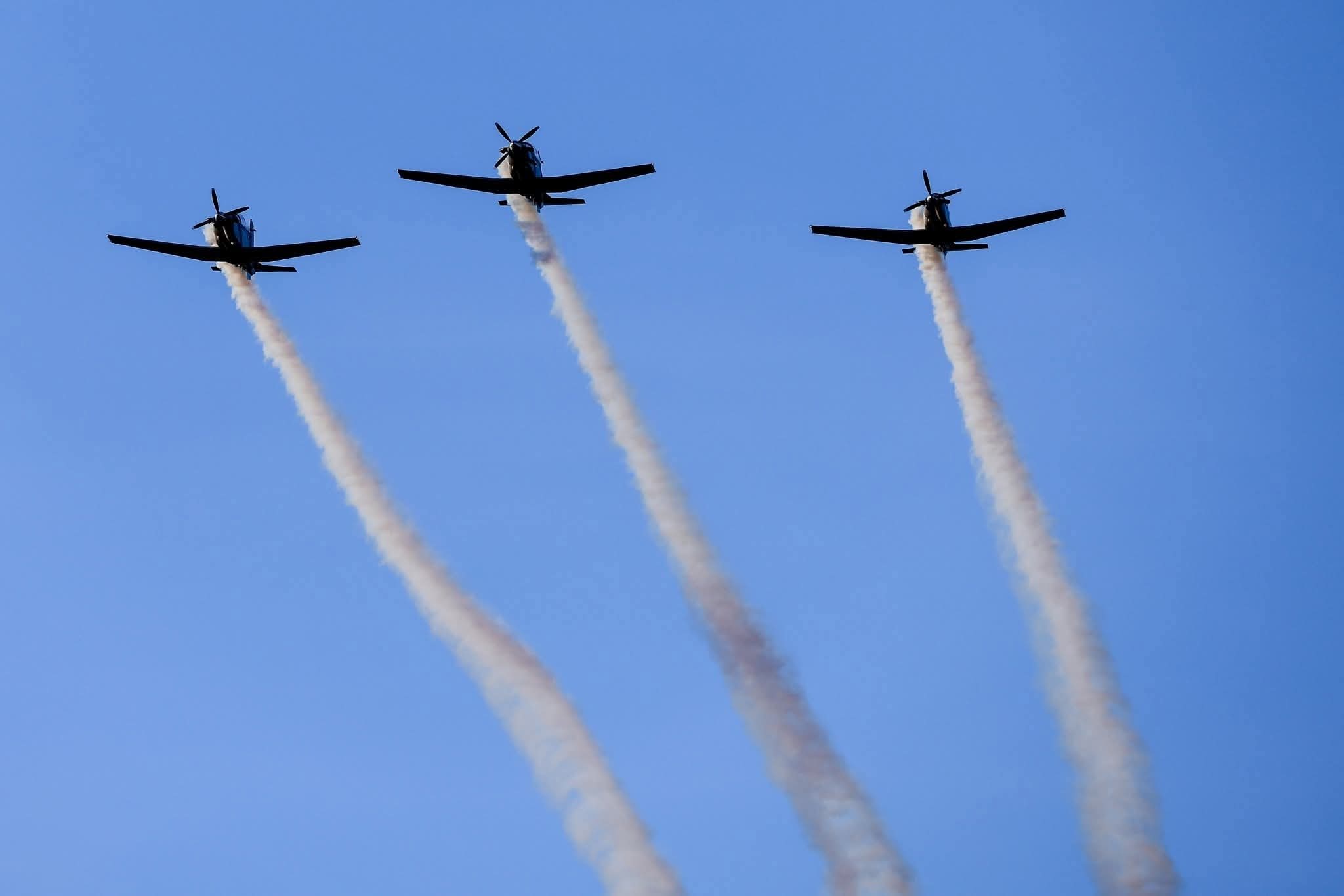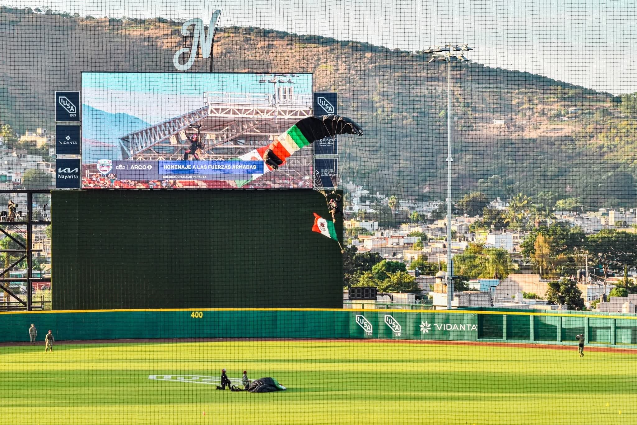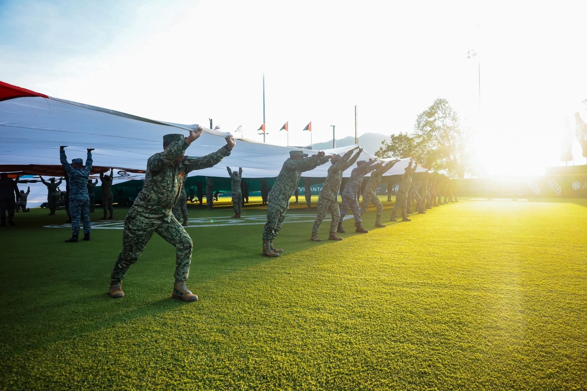 Como parte del acto, aeronaves sobrevolaron la zona deportiva mientras paracaidistas descendían en las inmediaciones del recinto, en un despliegue coordinado con personal del Ejército Mexicano, la Fuerza Aérea y la Guardia Nacional, lo que convirtió la antesala del juego en un espectáculo.