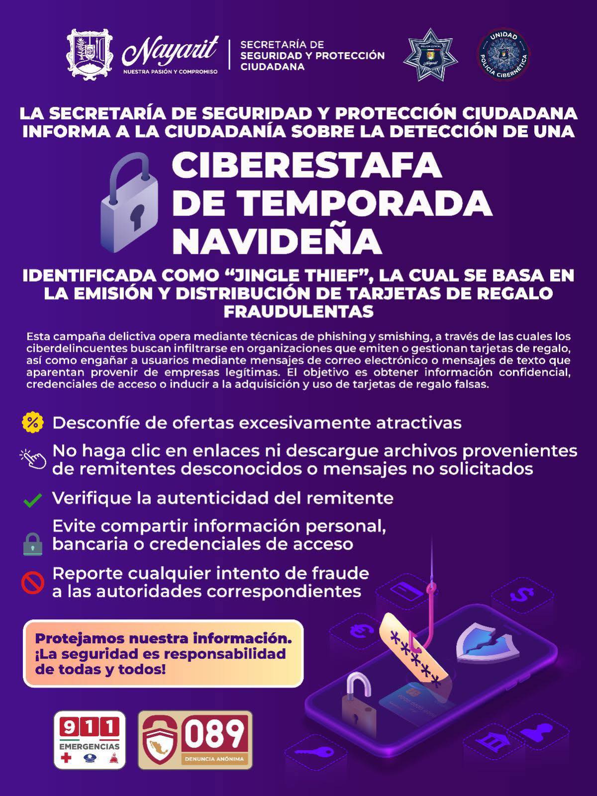 La dependencia subrayó la importancia de mantenerse alerta durante las festividades y reportar cualquier intento de fraude a las autoridades competentes. De igual manera, recordó que la seguridad en línea es responsabilidad de todos y que cada usuario debe ser cuidadoso al interactuar en el ciberespacio, especialmente en esta temporada.