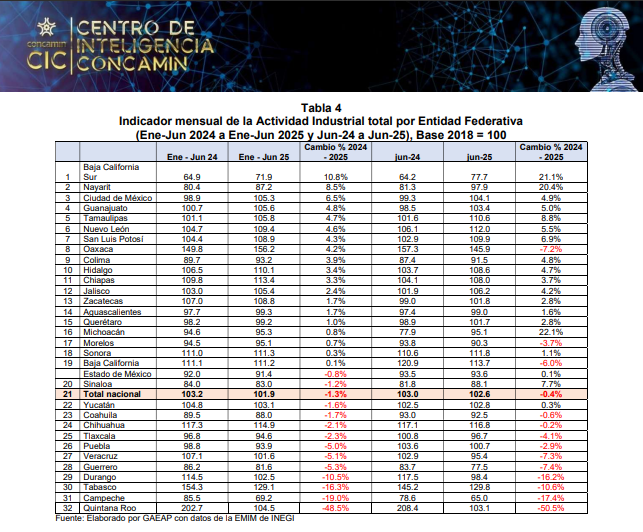 En contraste, los cinco estados con peor desempeño industrial en el mismo periodo fueron Guerrero (-5.3%), Durango (-10.5%), Tabasco (-16.3%), Campeche (-19.0%) y Quintana Roo (-48.5%).