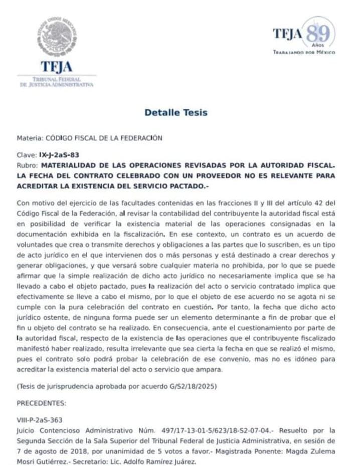 El Tribunal Federal de Justicia Administrativa (TFJA) publicó la jurisprudencia IX-J-2aS-83, que cambia la forma de comprobar la materialidad de las operaciones ante el SAT; es decir que la fecha y la firma de un contrato ya no sirven por sí solas para demostrar que un servicio se realizó ya que el contrato sólo acredita un acuerdo de voluntades entre las partes, no que el trabajo se haya ejecutado