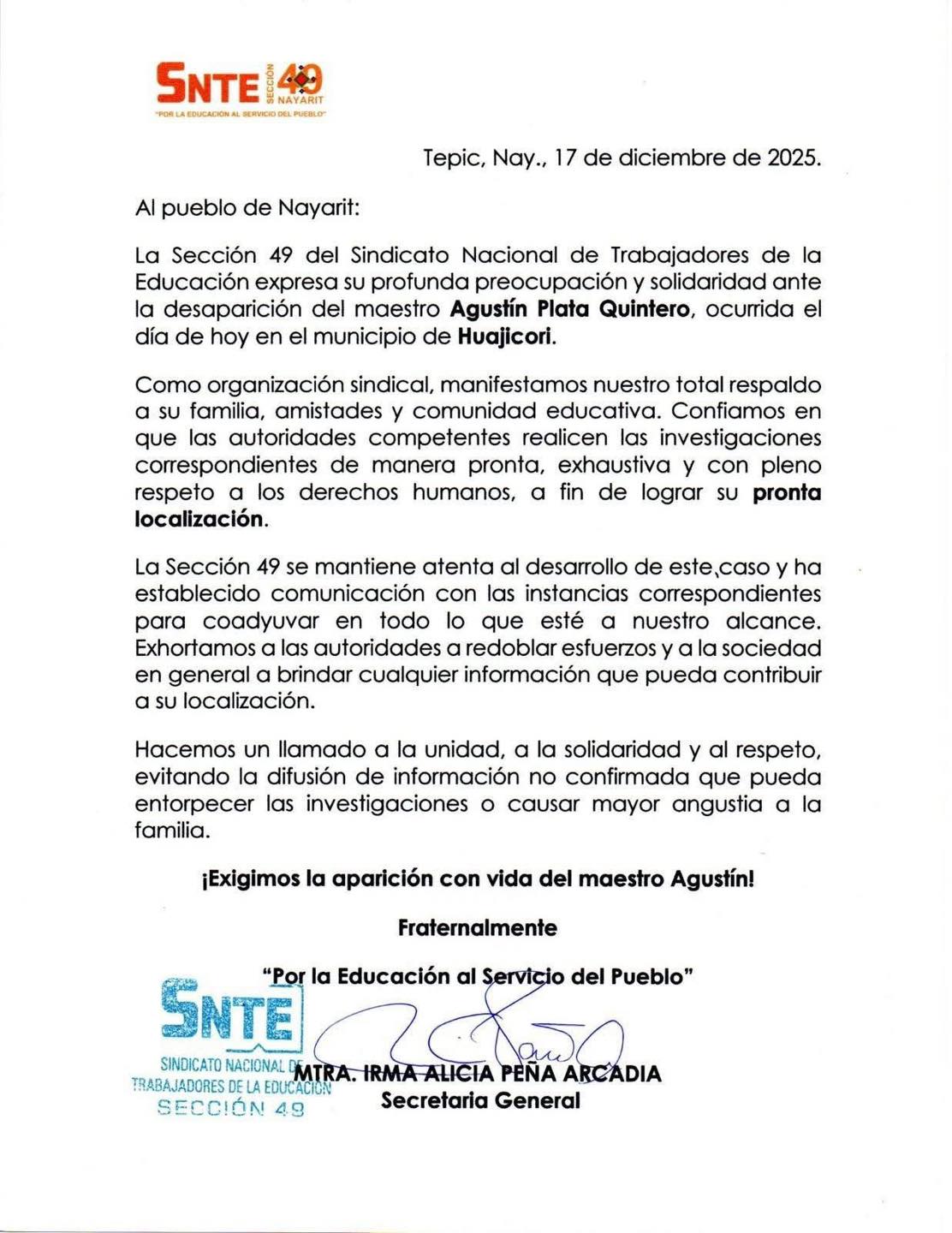 El Sindicato Nacional de Trabajadores de la Educación (SNTE), Sección 49, también se ha pronunciado sobre el caso, exigiendo la aparición con vida del maestro Agustín. A través de un comunicado, el SNTE expresó su respaldo total a la familia y comunidad educativa, y pidió una investigación exhaustiva y respetuosa de los derechos humanos para dar con su paradero. El sindicato también ha instado a la sociedad a colaborar con cualquier información relevante que ayude en la localización del docente.