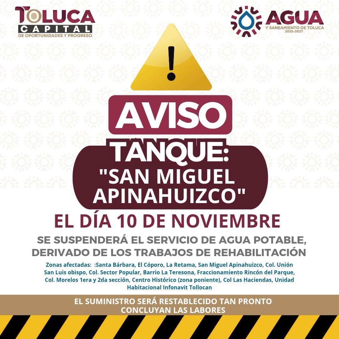 A partir del pasado 10 de noviembre, diversas colonias, incluidas algunas de la zona centro de la capital mexiquense, se quedaron sin servicio de agua potable debido a trabajos de rehabilitación en el Tanque "San Miguel Apinahuizco".