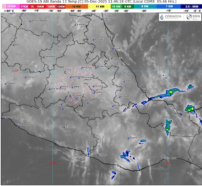 Para el estado de México, durante el día, se pronostica cielo medio nublado a nublado. Ambiente frío a fresco por la mañana en la región, y muy frío con bancos de niebla en zonas altas. Por la tarde, ambiente templado a cálido y probabilidad de chubascos con descargas eléctricas y lluvias aisladas.