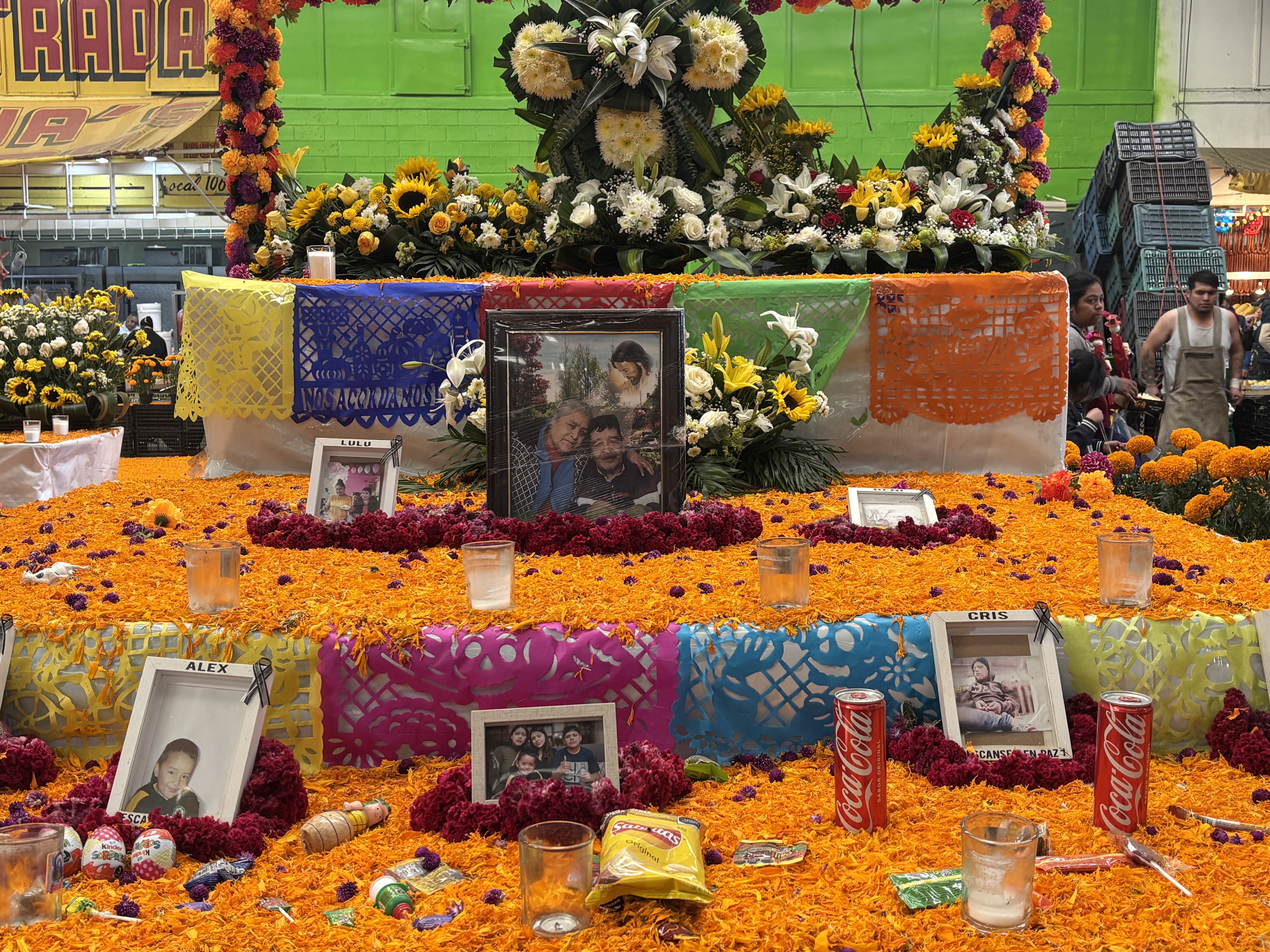 El espacio que un día albergó un local comercial, fue tapizado con pétalos de cempasúchil, en su interior se montó un camino iluminado de veladoras y en el altar principal fueron colocadas fotografías de las personas que trascendieron.