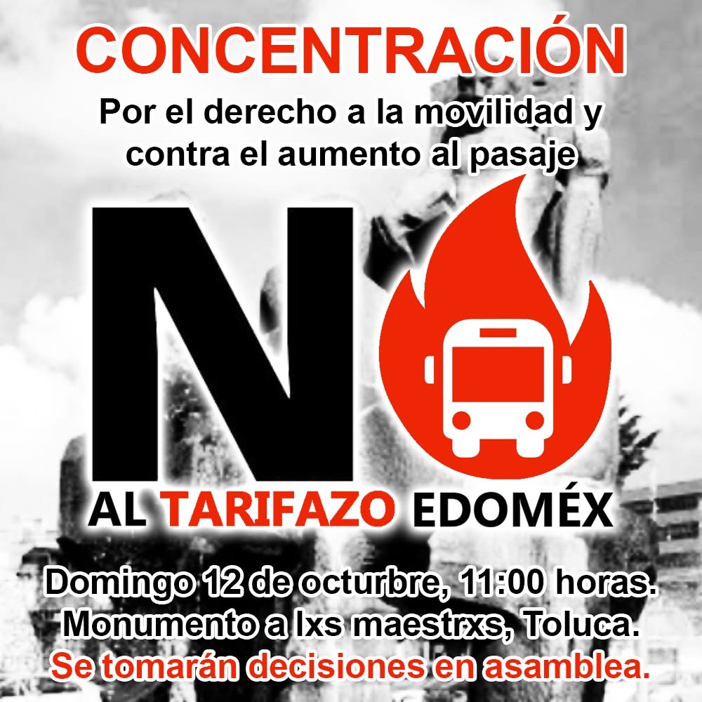 El colectivo No al Tarifazo Edomex convocó a una concentración ciudadana para el próximo domingo 12 de octubre, en respuesta al reciente anuncio del incremento en la tarifa del transporte público en el Estado de México.