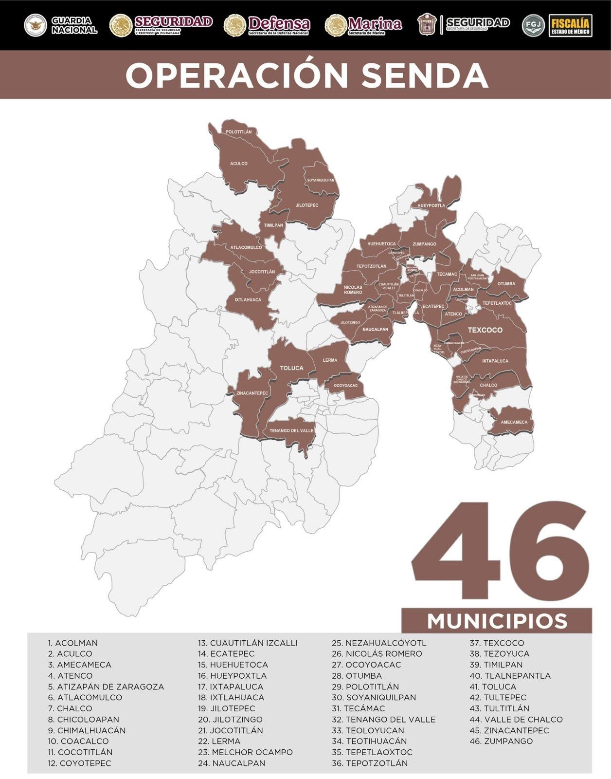 El operativo se llevó a cabo en 46 municipios de la entidad mexiquense, entre ellos Acolman, Naucalpan, Nezahualcóyotl, Toluca, Ecatepec, Tlalnepantla y Tultitlán, de los cuales tuvo impacto en ocho bandas delictivas en las que se encuentran los Ticos, Pantera y los Marmolejo.