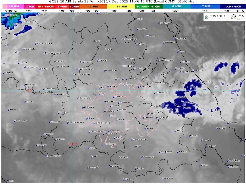 Para el estado de México, por la mañana, se pronostica cielo parcialmente nublado, ambiente fresco en la región y frío en zonas altas. Bancos de niebla al amanecer. Por la tarde, ambiente templado con probabilidad de lluvias e intervalos de chubascos con descargas eléctricas y posible caída de granizo.