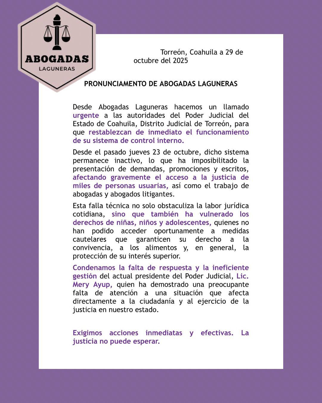 A través de un pronunciamiento, las especialistas exigen al Poder Judicial del Estado de Coahuila que reestablezca, de manera inmediata, el sistema, de tal manera que se pueda llevar a cabo cualquier trámite y particularmente la presentación de demandas y procedimientos jurídicos.