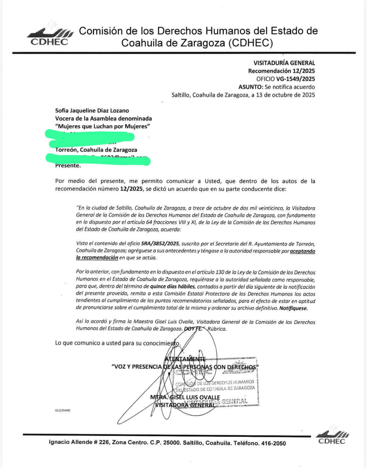 En entrevista, Sofía Díaz, abogada y vocera de la Asamblea, señaló que el colectivo espera que la autoridad municipal cumpla cabalmente con todos los puntos establecidos en la recomendación.