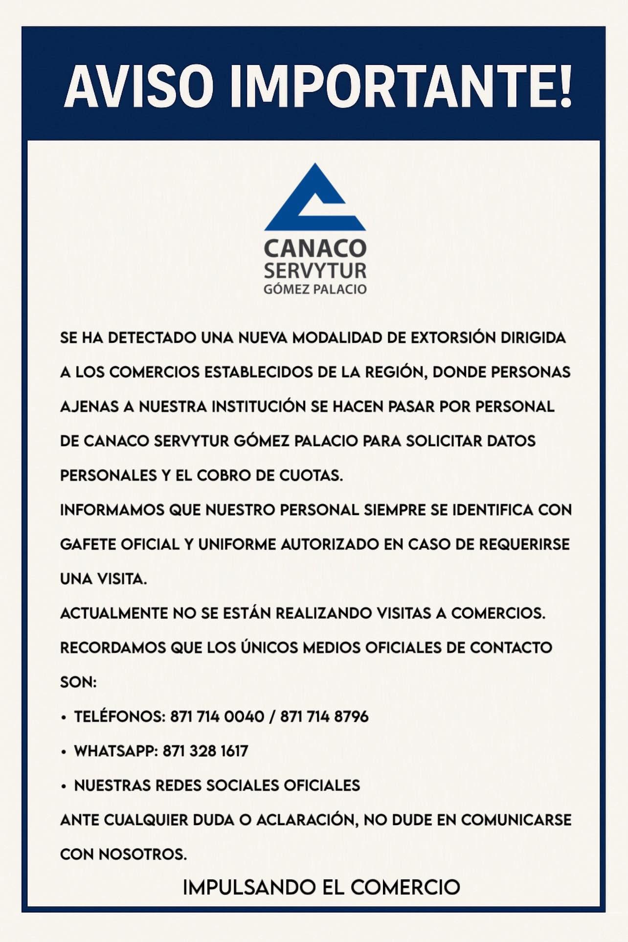 La Cámara Nacional de Comercio (Canaco) y Servicios de Turismo de Gómez Palacio lanzó una alerta por intentos de extorsión dirigidos a comerciantes y ciudadanía, luego de que personas ajenas al organismo se están haciendo pasar por trabajadores oficiales. De acuerdo con su presidente, Arcenio Alvarado Luján, el problema comenzó la semana pasada, cuando socios de la cámara empezaron a recibir llamadas sospechosas, realizadas en horarios inusuales, incluso durante la madrugada. La Canaco advierte que estos contactos buscan obtener información personal y comercial para fines de extorsión, por lo que pide a los afectados reportar cualquier intento inmediatamente.
