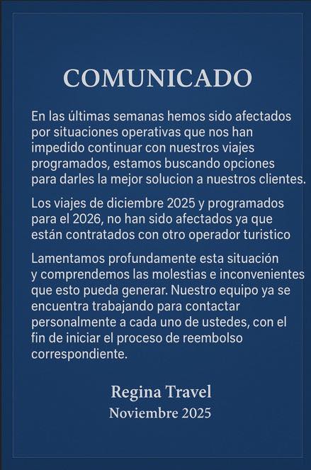 En respuesta, la agencia Regina Travel Torreón publicó un comunicado oficial en su página de Facebook, donde afirma que han sido afectados por "situaciones operativas" que impidieron continuar con los viajes programados. Además, aseguran estar "buscando opciones para dar solución a los clientes" y que los viajes de diciembre de 2025 y de 2026 "no han sido afectados", ya que dependen de otro operador turístico. La empresa también menciona estar trabajando en contactar a cada cliente "para iniciar el proceso de reembolso correspondiente".