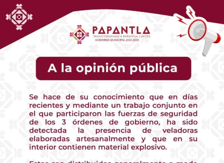 El Ayuntamiento de Papantla emitió un llamado urgente a la población luego de que autoridades de seguridad de los tres órdenes de gobierno detectaran la presencia de veladoras elaboradas artesanalmente que, en su interior, contienen presunto material explosivo.