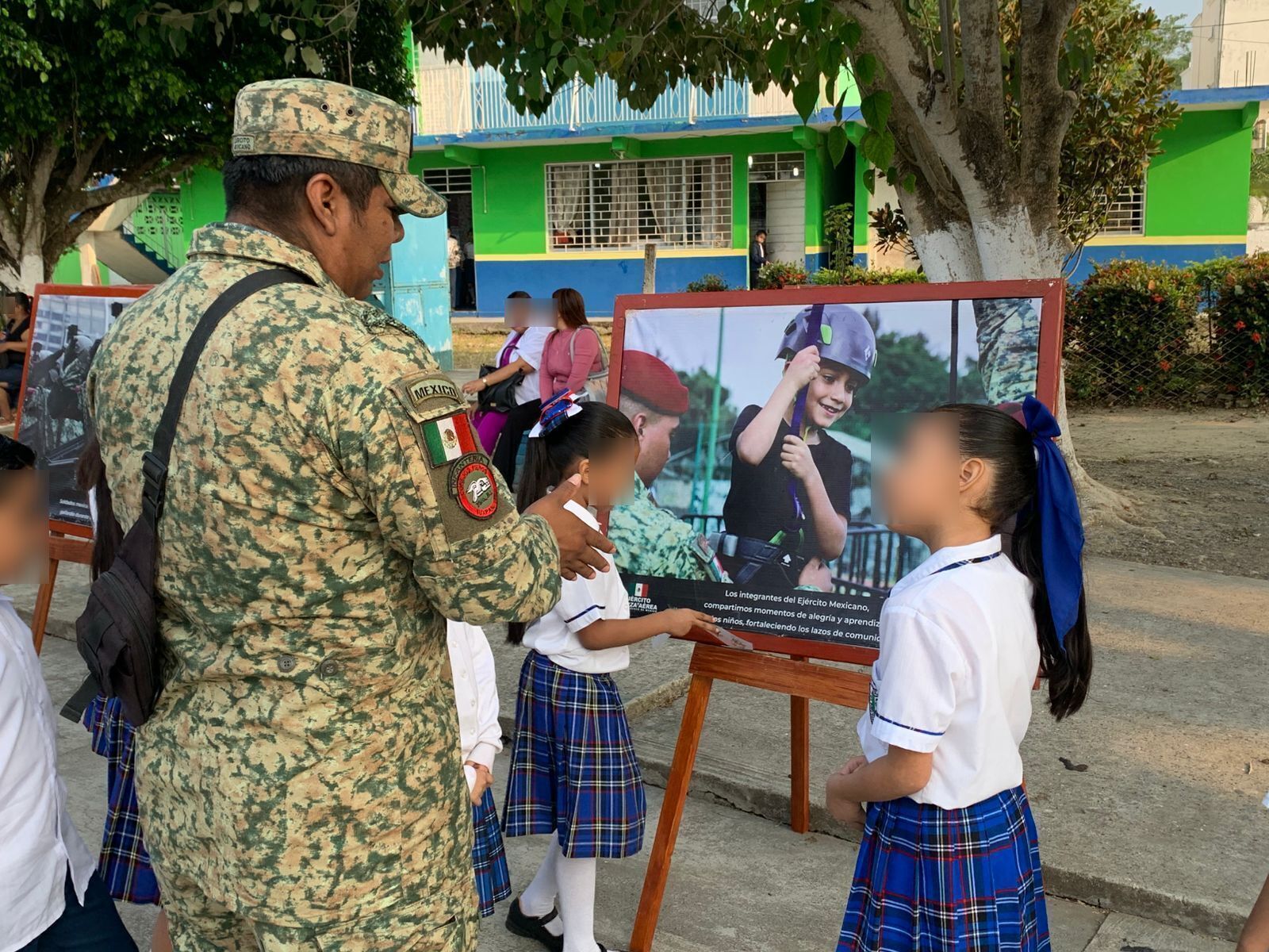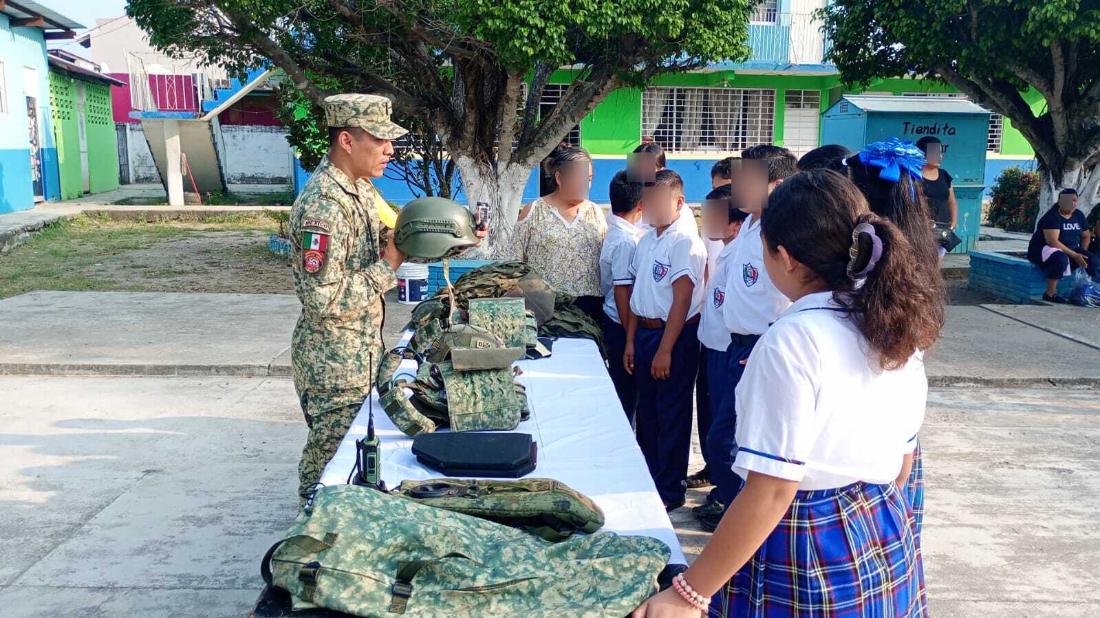 En la Escuela Primaria José María Pino Suárez se llevó a cabo una Exposición Militar, donde alumnos, docentes y padres de familia conocieron de cerca el trabajo de las Fuerzas Armadas mediante módulos interactivos de equipo y camuflaje, comunicaciones, salud y exhibición fotográfica, además de convivir con el personal militar.