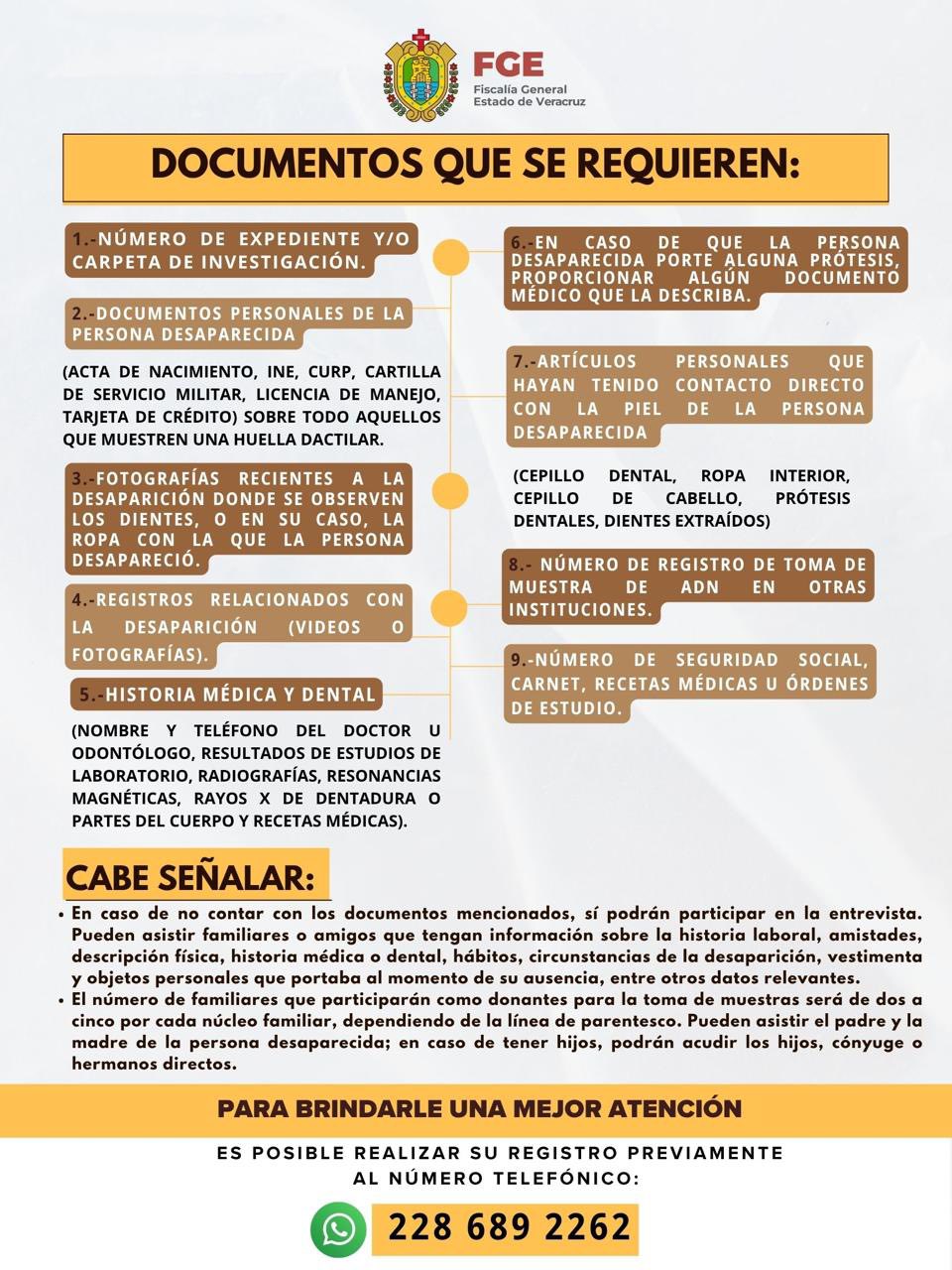 La FGE indicó que para facilitar el proceso, los familiares deberán presentar diversos documentos, entre ellos el número de expediente o carpeta de investigación, documentos personales de la persona desaparecida, fotografías recientes, historia médica o dental, y artículos personales que hayan tenido contacto directo con la piel, como cepillos dentales o prendas de vestir.