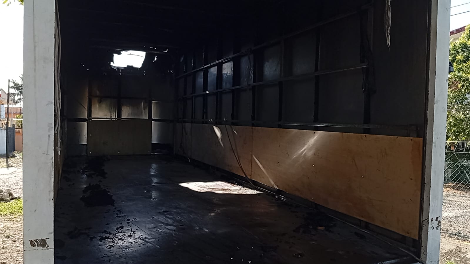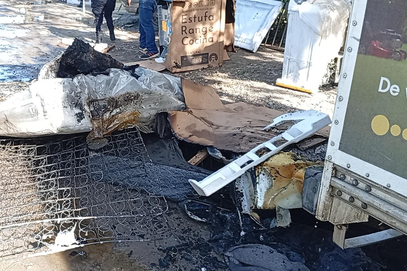 En cuestión de minutos, las llamas consumieron buena parte de la mercancía que transportaba, entre ellas colchones, estufas, lavadoras y bases metálicas.