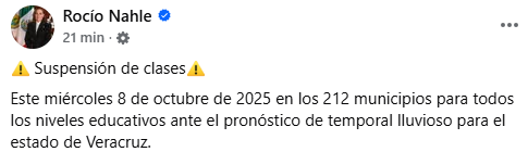La Gobernadora del Estado, Rocío Nahle informó que el Comité Estatal de Emergencias determinó la suspensión general de clases en los 212 municipios el día miércoles 08 de octubre, para todos los turnos y niveles educativos así también las labores docentes y administrativas en centros escolares.