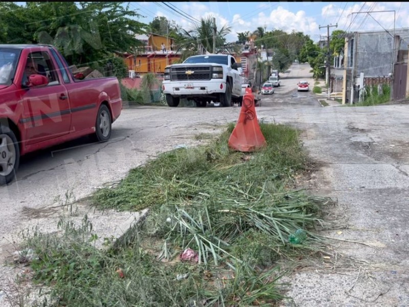 El descuido ha sido tal que la maleza ha crecido en el lugar. Para prevenir accidentes, habitantes colocaron un señalamiento, luego de que algunos automovilistas sufrieran percances al pasar por el tramo. Los vecinos hicieron un llamado a las autoridades correspondientes para que atiendan de manera urgente esta situación.